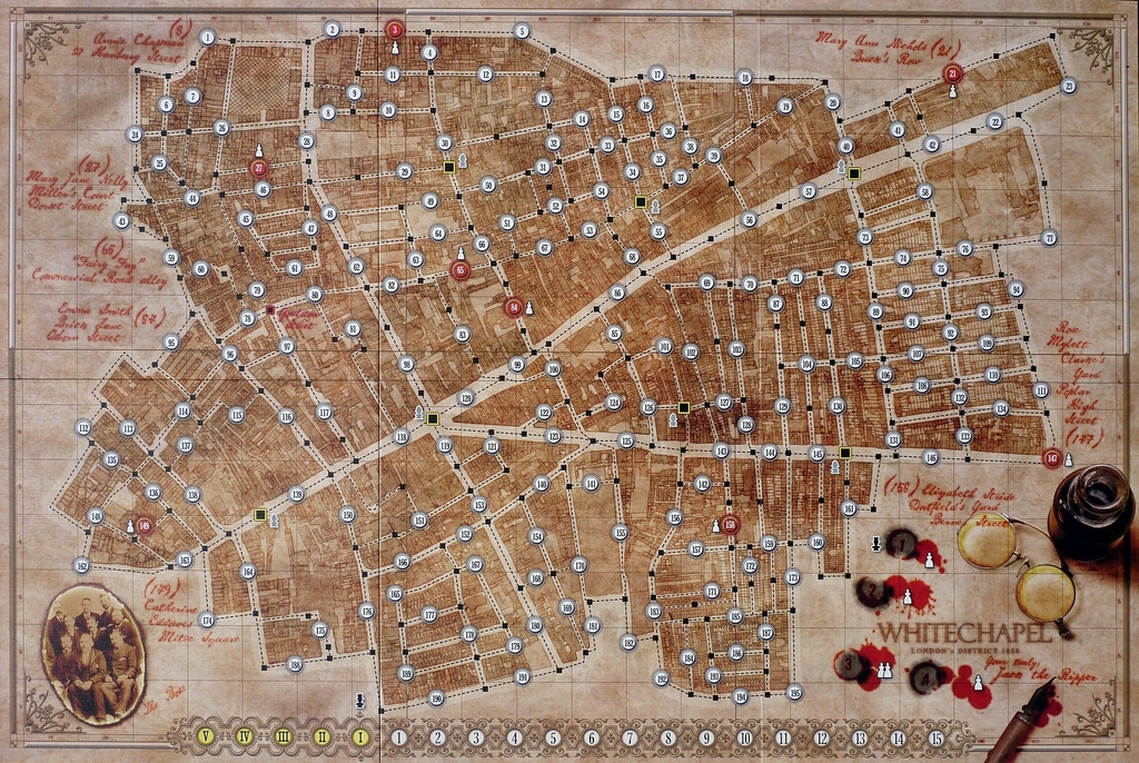 Fantasy Flight’s Letters from Whitechapel is a deduction game set in London, 1888. One player takes on the role of Jack the Ripper, moving through London, recording his own movements on a pad of paper. Meanwhile, five other players will control the police pawns who are frantically searching for the killer.