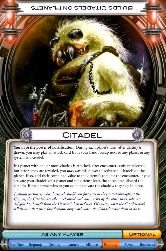 Cosmic Encounter is another game from Fantasy Flight Games, producers of amazing games and horrific rulebooks. This is a game I have only gotten into recently, but it is already becoming a firm favourite. It is a simple game of negotiation, bartering and aggression. The game begins with each player choosing a race at random from the race deck. The box comes with a whopping 50 races to choose from, and there are 4 expansions which each add a further 20 to the game. Each race is very different, giving the players unique powers that can affect or, in some cases, fundamentally change the game. Click on the images to get a closer look at these examples: