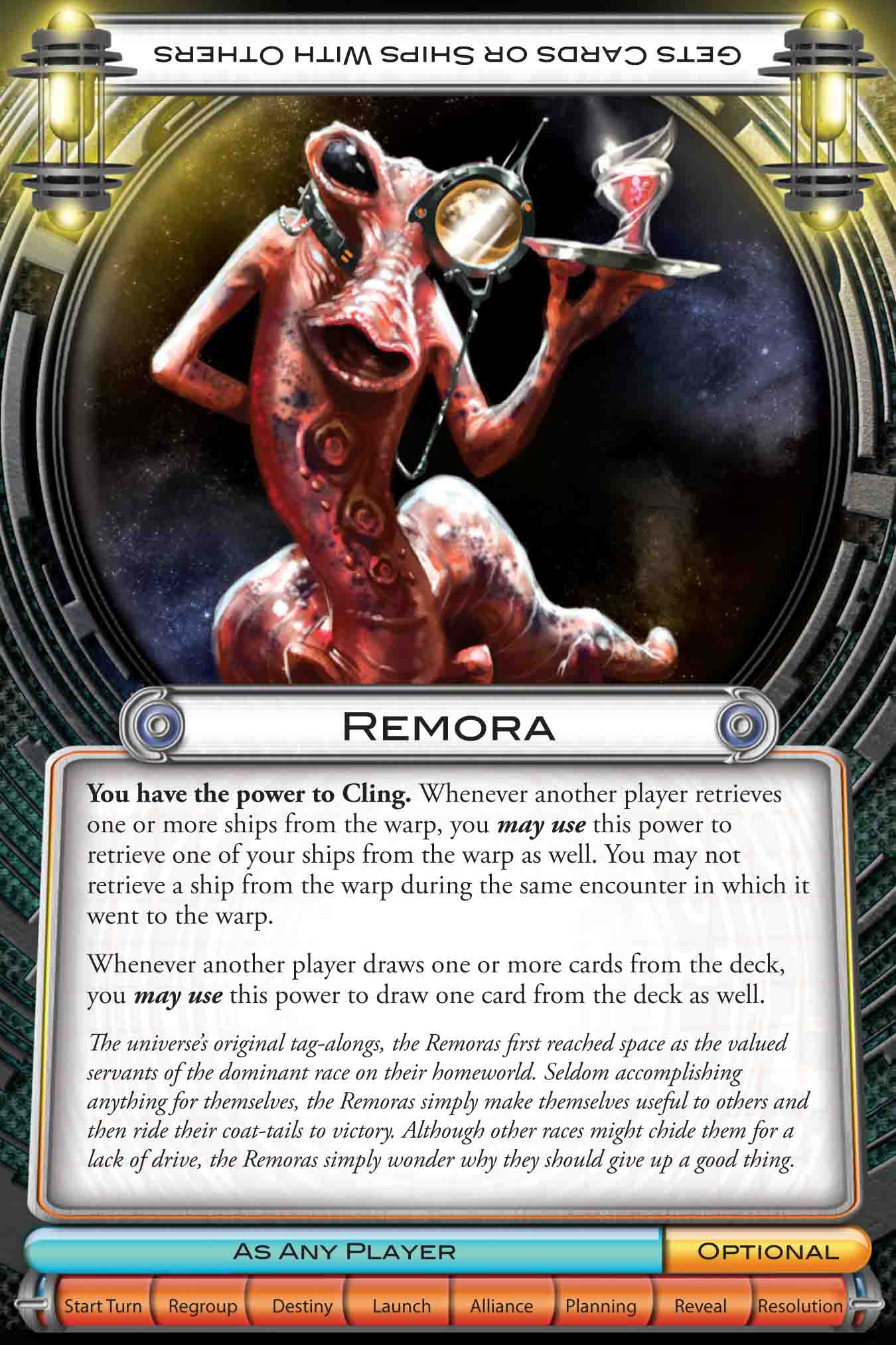 After races are sorted, each player takes 5 planet tokens to be their home system and puts four of their ships on each planet to represent their starting colonies. Your goal in this game is to establish five colonies in foreign systems. This is done by attacking randomly selected players. You will be given the system you must attack, but can choose which planet within the system you want to invade. Do do this, you take ships off your current colonies to create your invasion force. The attacking and defending players can then ask for allies to either add ships to the attacking or defensive forces. Allies share both the risks and rewards of the battle. Whichever team loses has all of their ships banished to the warp. If the attackers win, the attacking allies can set up a colony on the planet alongside the main attacking player. If the defending team wins, the allies are rewarded with cards from the deck.