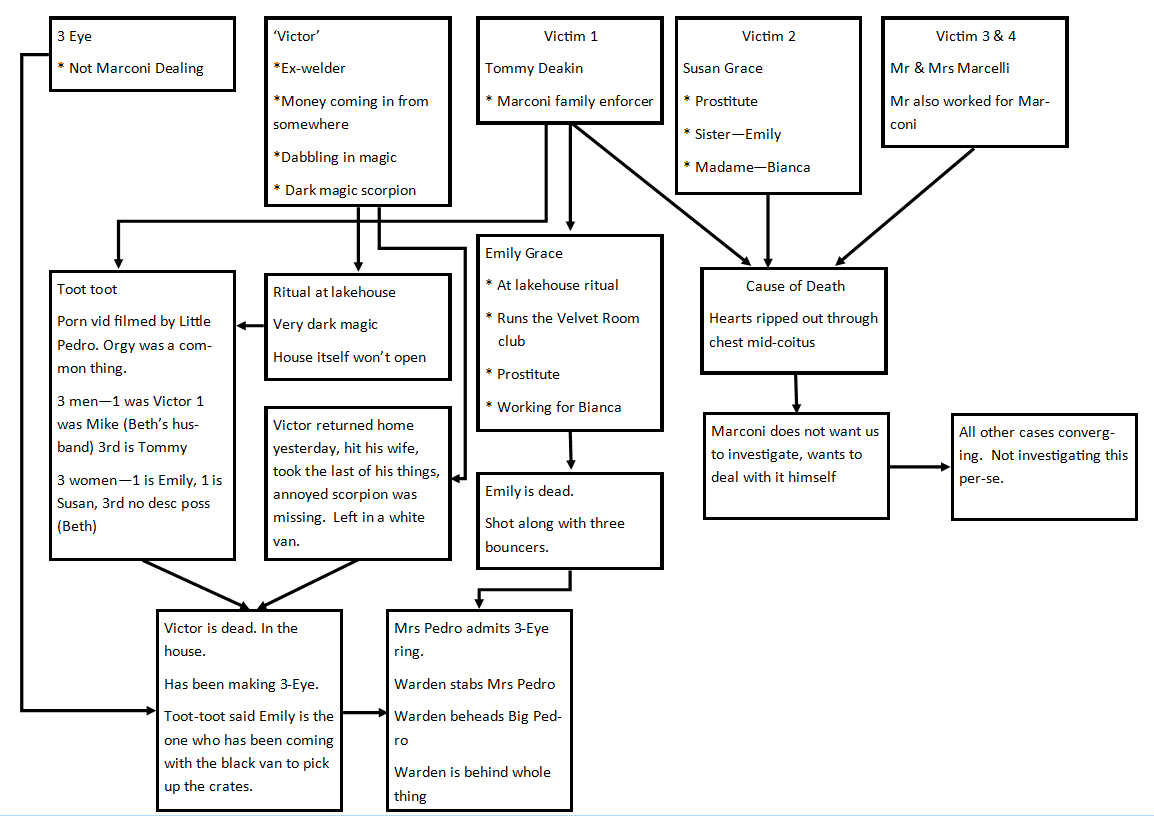 One last thing I would like to share is the fantastic work that the group’s investigator did in mapping out the clues and events that the group encountered. This was all her own work, based on her observations during the game. You can click to get a closer look: