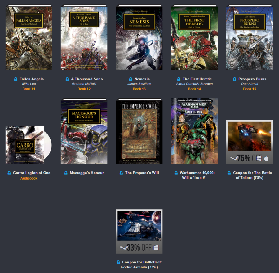Finally, the third tier gives another 5 books, including two of my absolute favourites in the form of A Thousand Sons and The First Heretic. I’m keen to follow up on A Thousand Sons by reading Prospero Burns. Again, we have a Garro audiobook, but we also have some other cool extras, including a graphic novel and an artbook. Not bad for $15! I suppose it evens out to a dollar a book, with the extras chucked in for free.