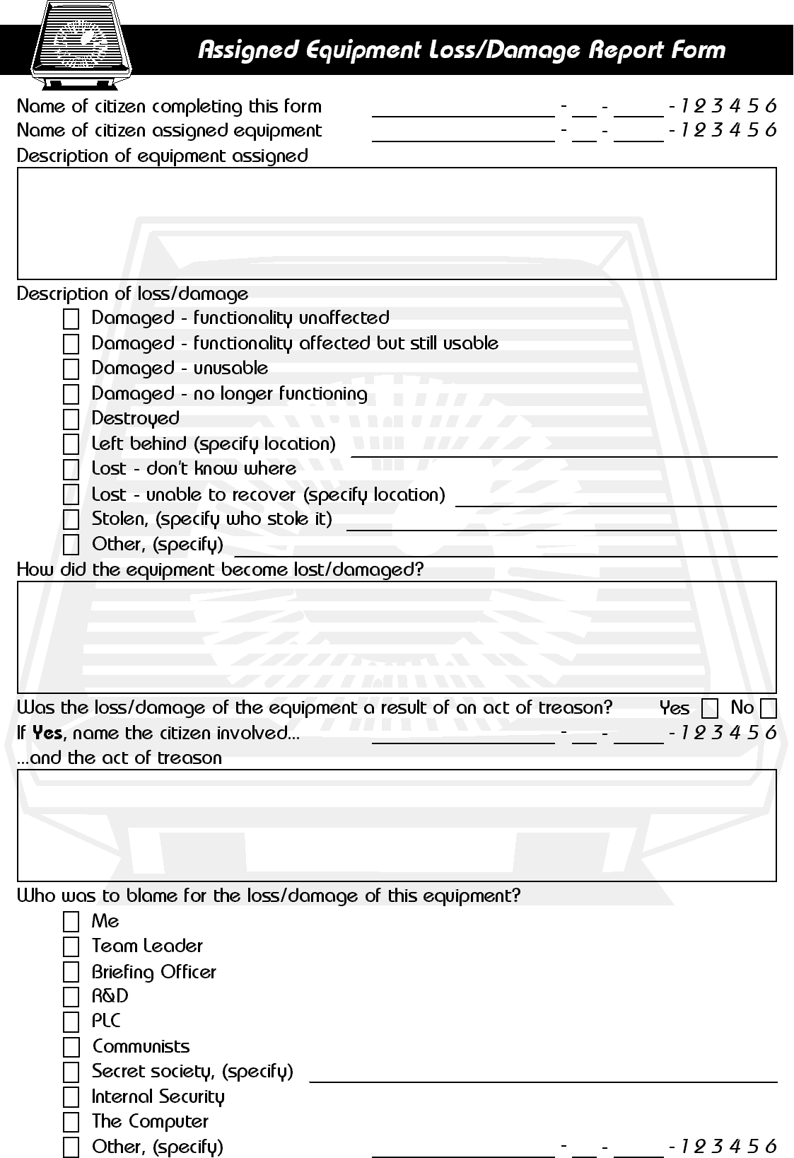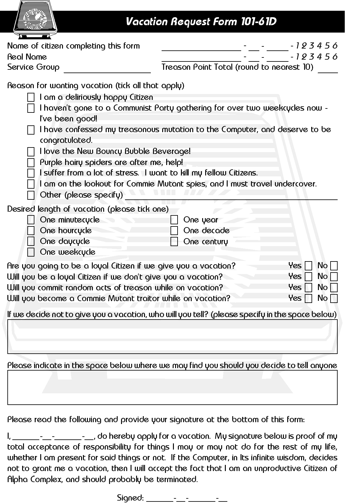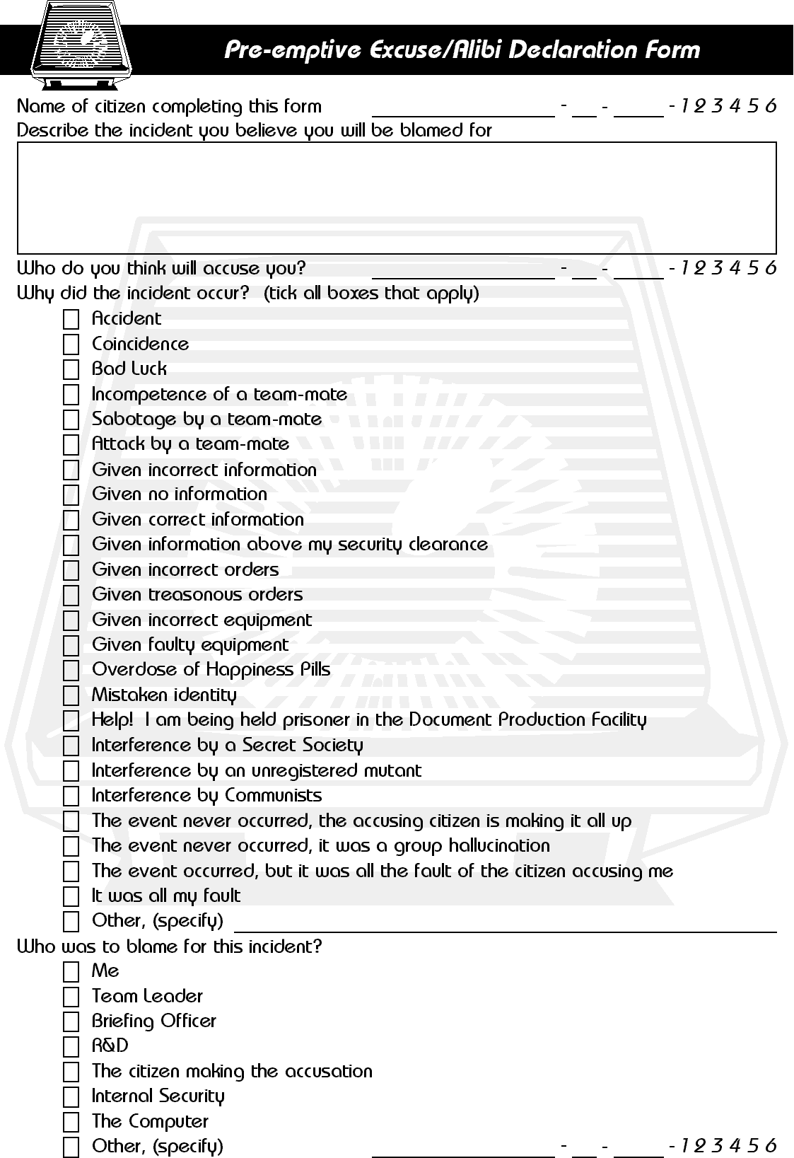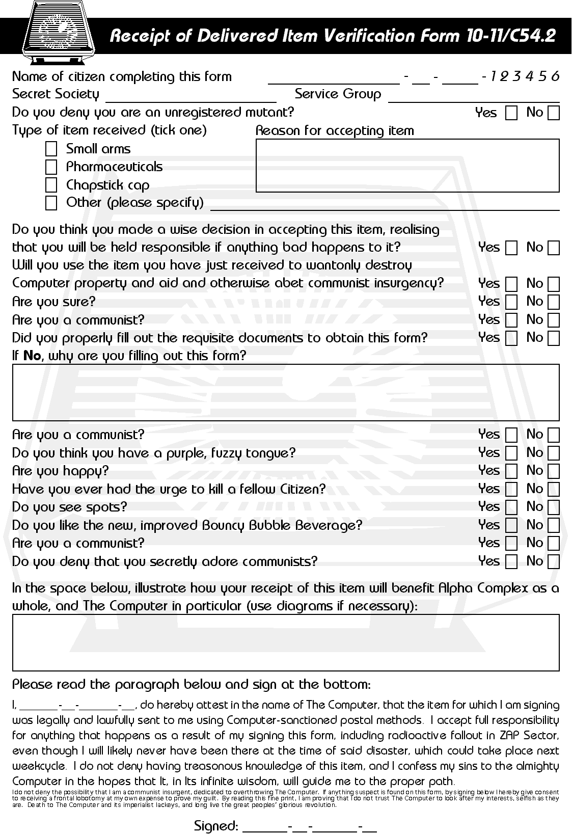 In my own games of Paranoia I’ve made piles of forms available in the middle of the table and encouraged players to take the required form either at the urging of Friend Computer and other NPCs, or when they themselves need a form. Such need might include the reporting of damage to precious equipment, or requesting the termination of another player whom they suspect of treachery, communist sympathies or poor personal hygiene. The forms represent fantastic props and great tools for player engagement.
