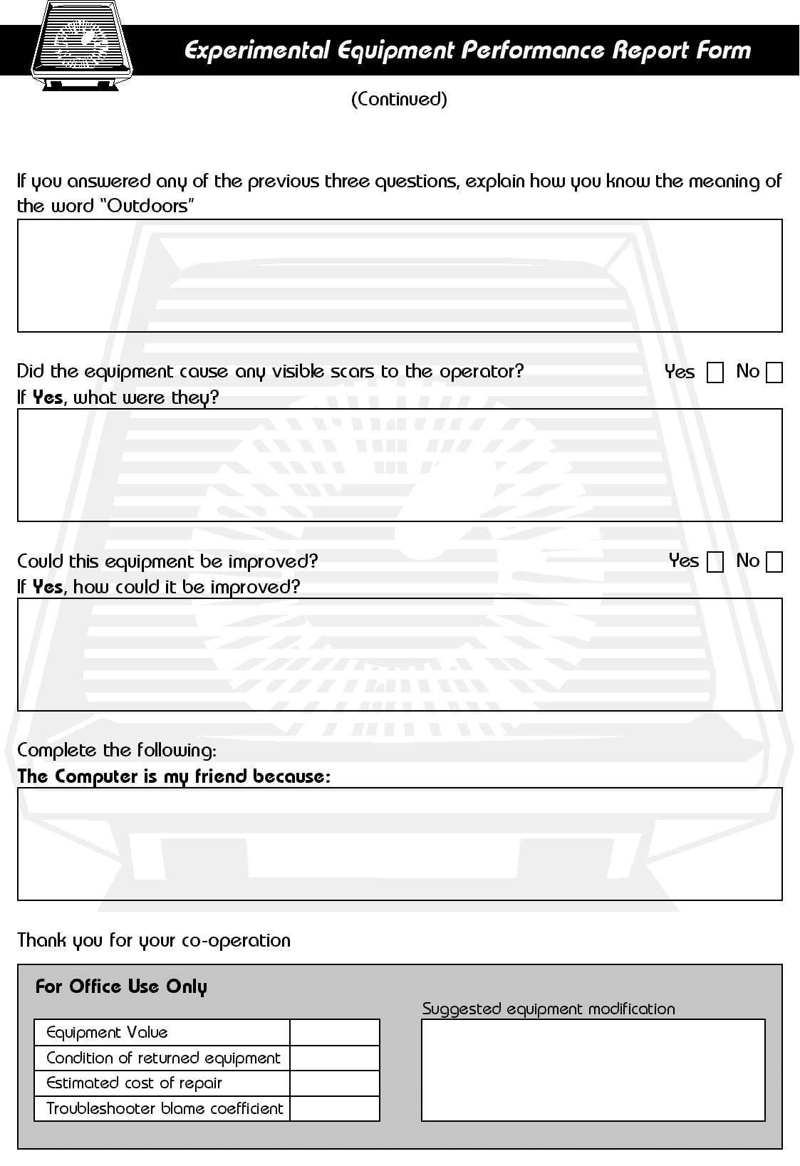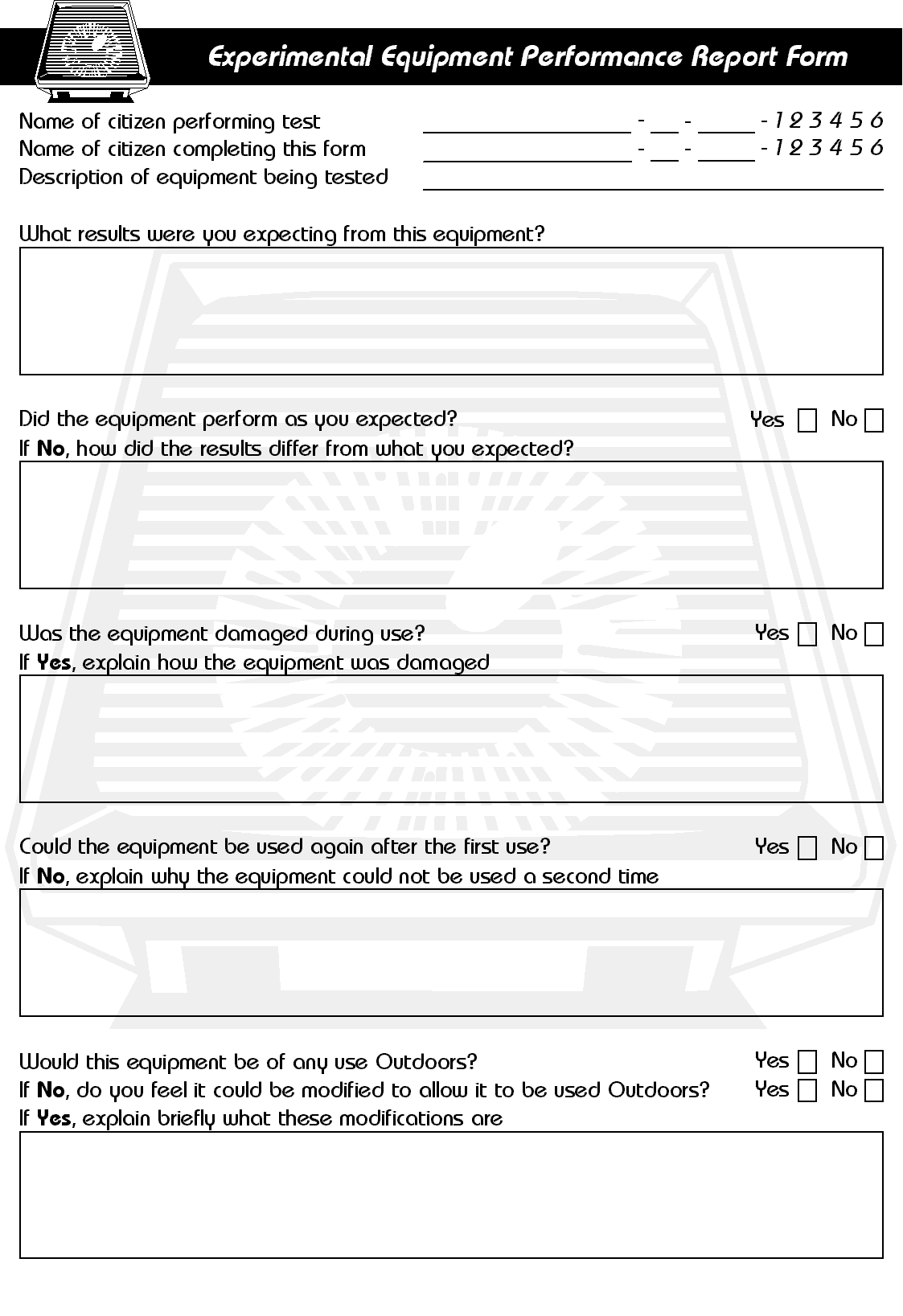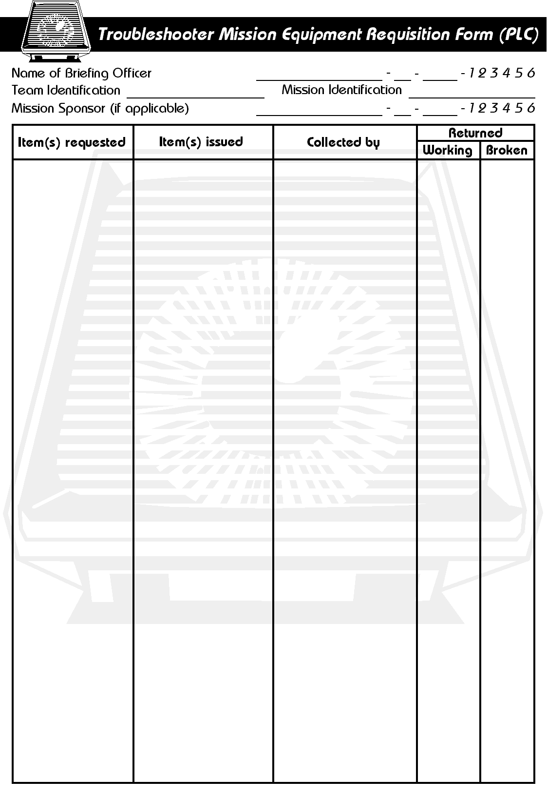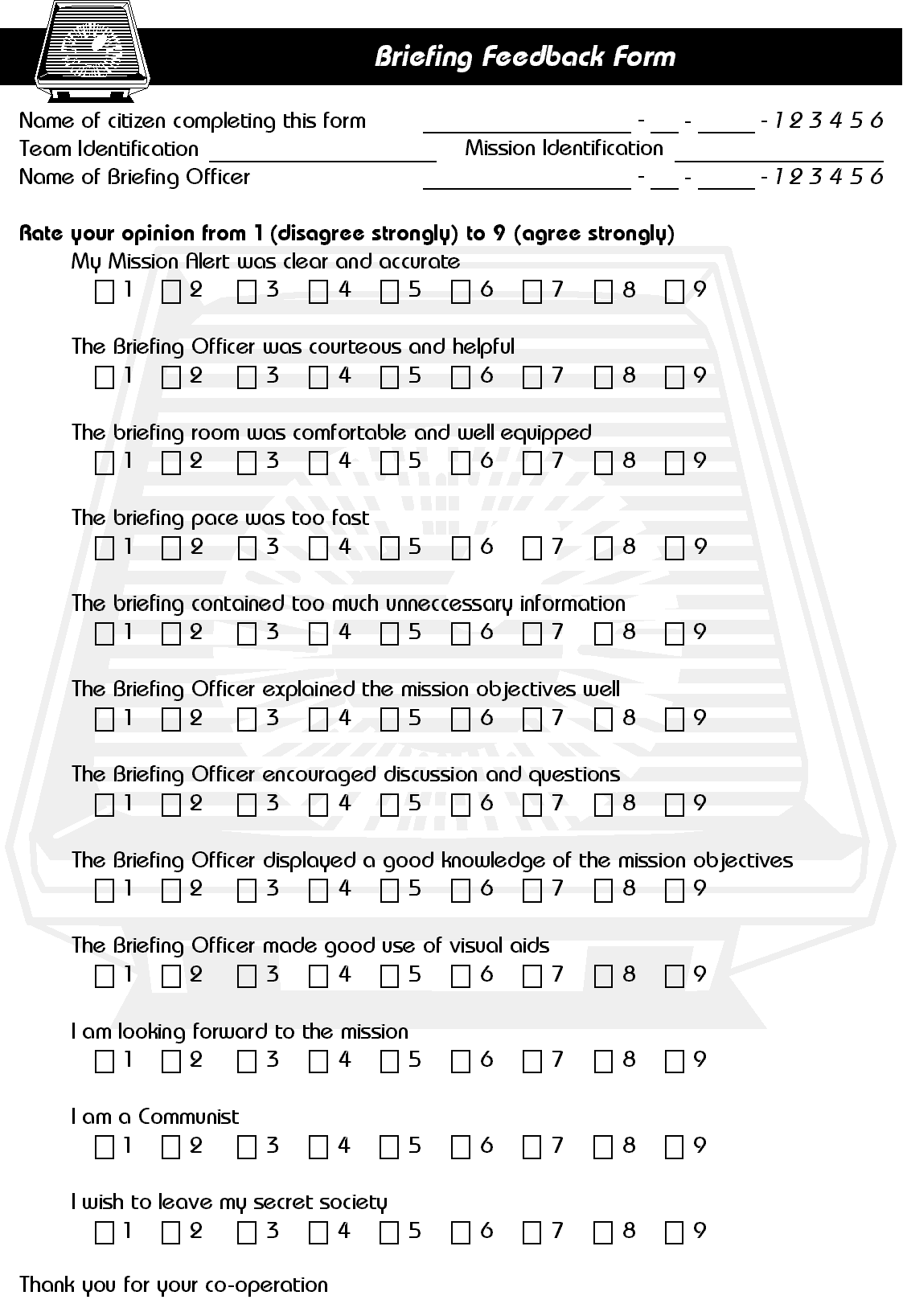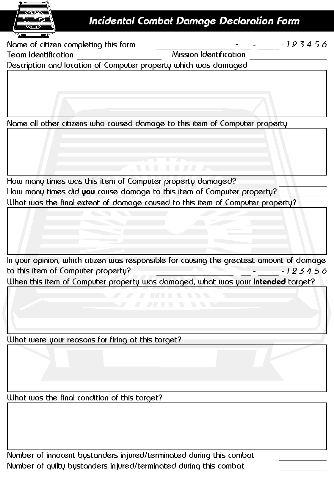 In my own games of Paranoia I’ve made piles of forms available in the middle of the table and encouraged players to take the required form either at the urging of Friend Computer and other NPCs, or when they themselves need a form. Such need might include the reporting of damage to precious equipment, or requesting the termination of another player whom they suspect of treachery, communist sympathies or poor personal hygiene. The forms represent fantastic props and great tools for player engagement.