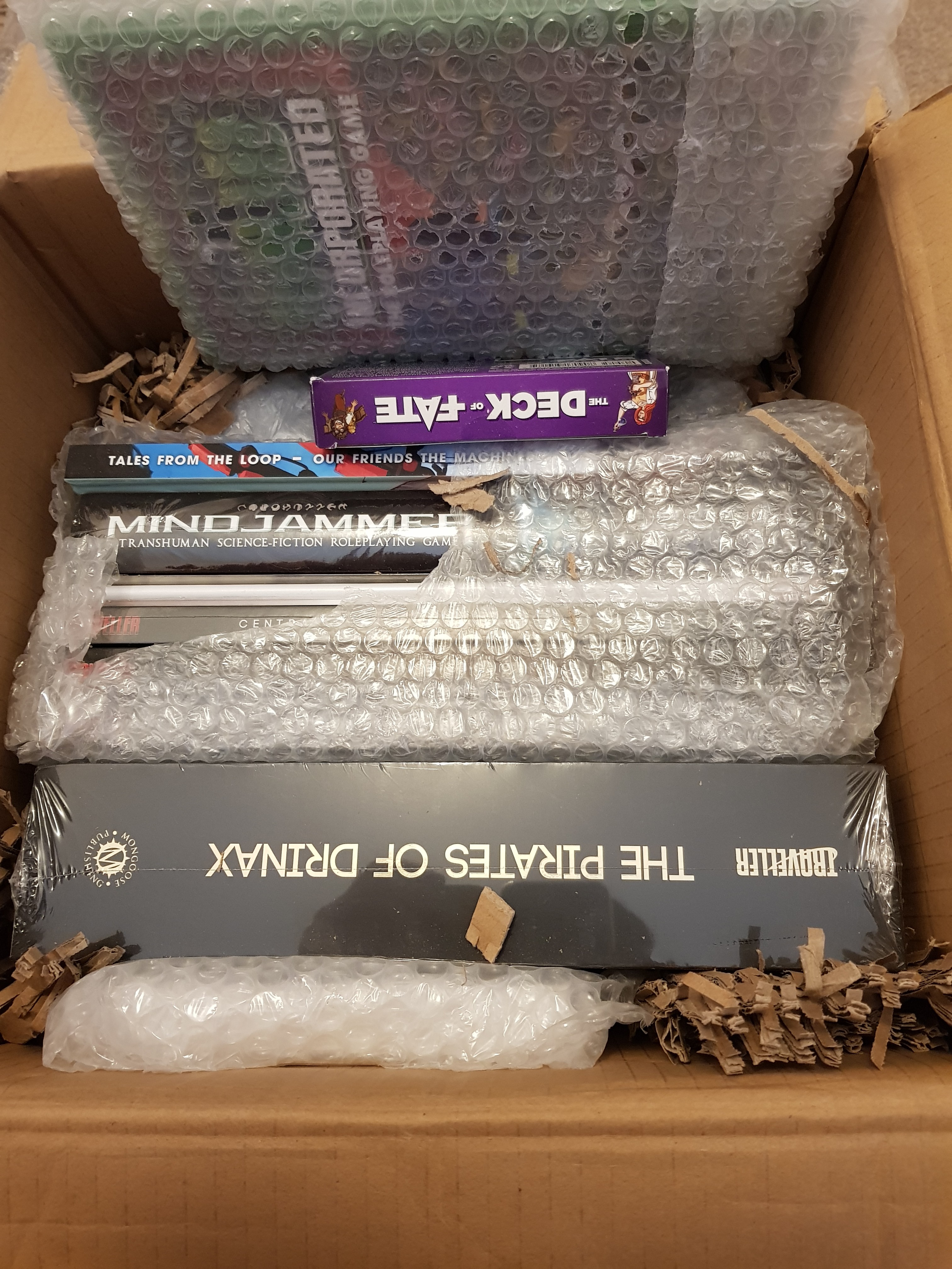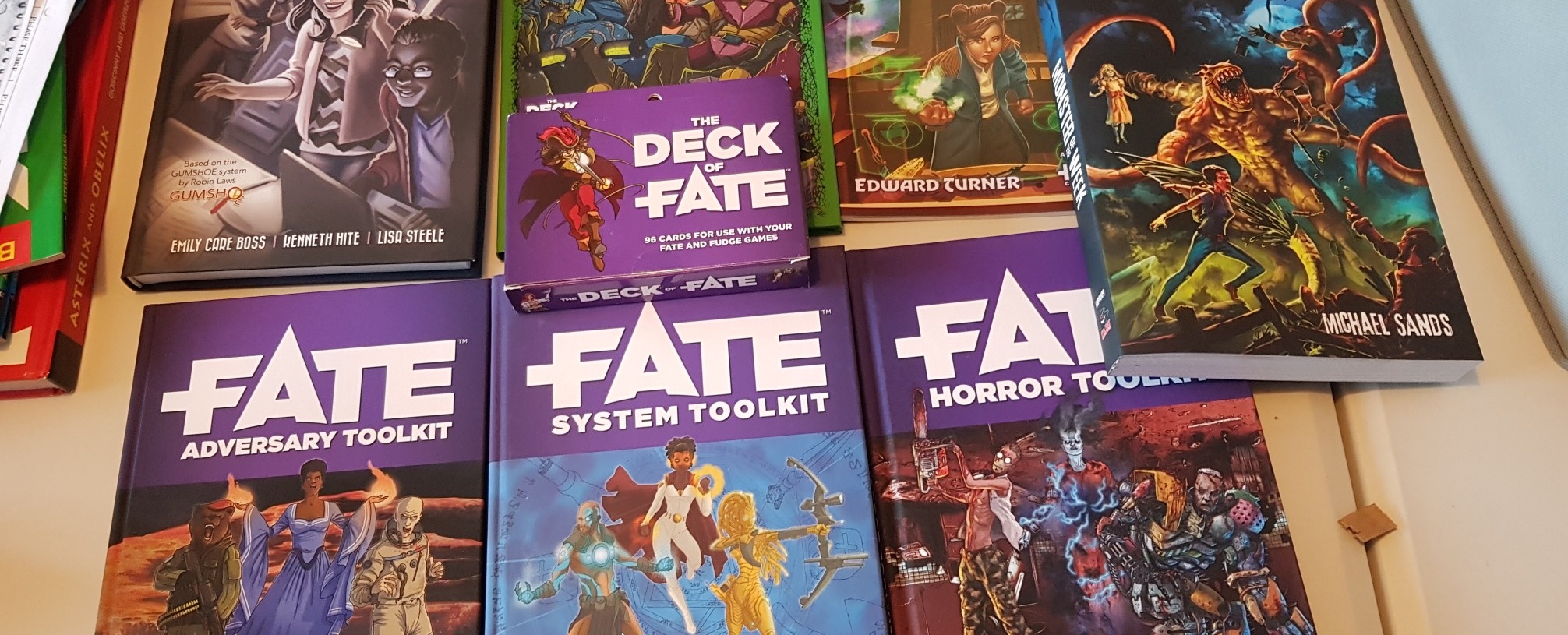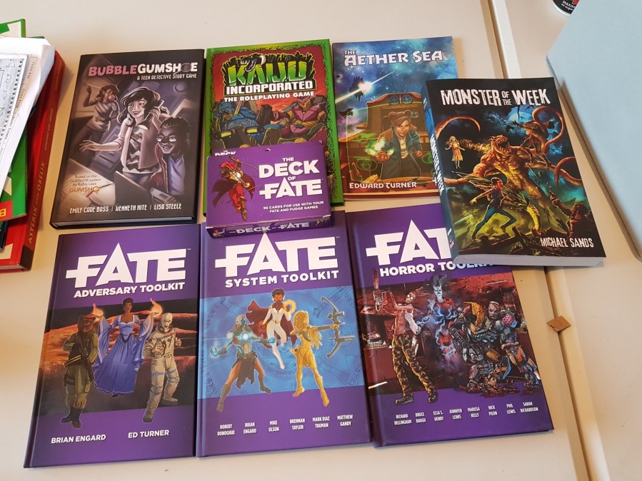 The first thing that arrived was a big selection of books from Evil Hat, one of my favourite RPG publishers.  I love their FATE system, with Dresden Files being one of the best RPGs I have ever played.  As such, it was exciting to get lots of toolkits for the fate system and a couple of settings and standalone games.