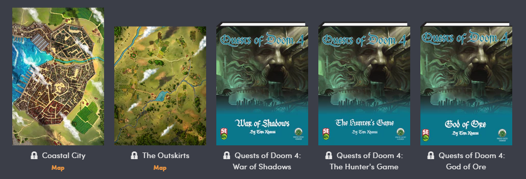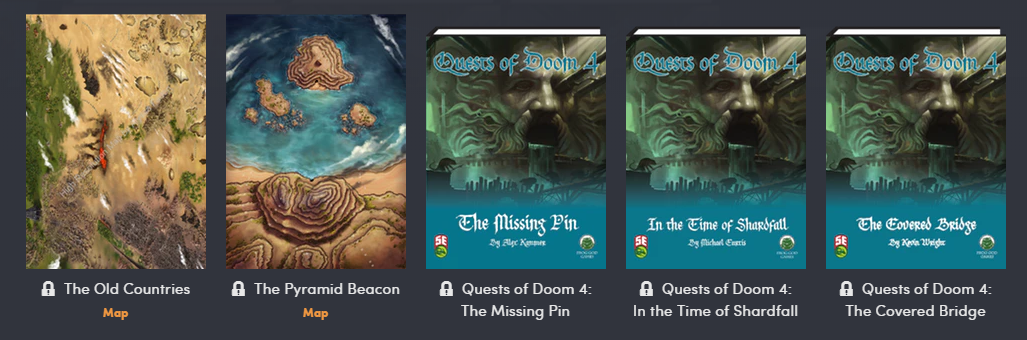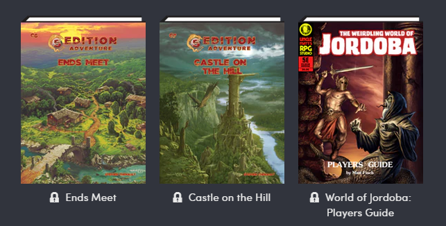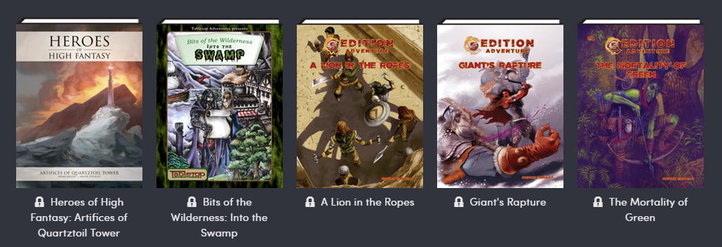 This is the most interesting tier for me. I really like the look of several of the adventures – especially Castle on the Hill. The Demon Cults & Secret Societies book is also really tempting, but then the Kobold Press books are always fantastic. The Revenge of the Horde book also looks great, with great materials about commonly-encountered monstrous races.