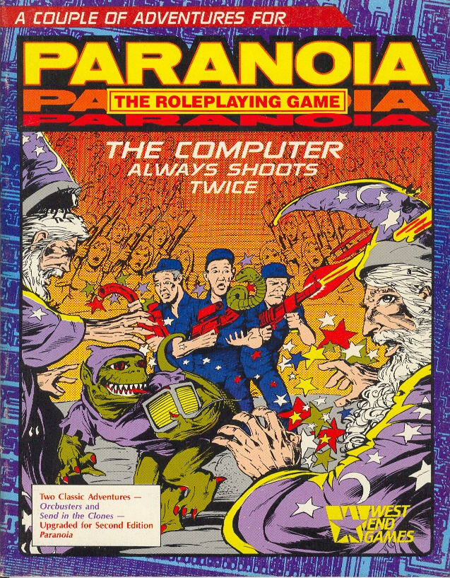 For me, Paranoia is at its best when it is strange, funny and subversive. Orcbusters is all these things. The premise is that a group of wizards (and their lizardman apprentice) are transported to Alpha Complex and start causing havoc. You are one of the troubleshooters sent by Friend Computer to resolve this crisis. Needless to say, chaos ensues. The book is, as you’d expect, chock-full of references to D&D and other RPG tropes (these hold up!) and jokes about TSR (these don’t hold up quite as well).