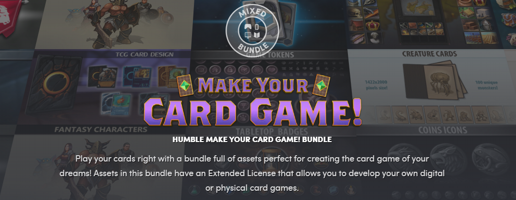 There’s an interesting bundle available just now from Humble Bundle. It’s a set of resources for making your own card game. I know that a lot of gamers like to homebrew and have ambitions of making their own games, even just as experiments, if not commercially. So, yeah, let’s take a look!