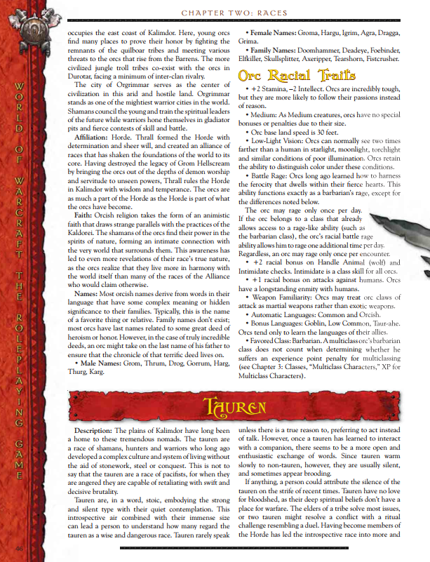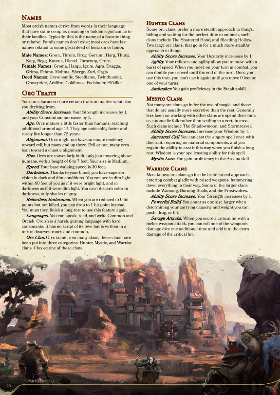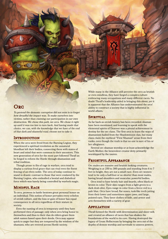 The 5E version is gorgeous. It uses the same piece of racial artwork, which is great. I like that they did this. It also includes some really nice background art of Orgrimmar. It actually looks like the Orc was always part of the background art, but if you check the file, you see that he is overlayed onto it. The layout and style closely follows that of the official D&D books. It uses the same font, backgrounds, headings and so on. The writing is more concise and I really like the first paragraph, from an Orc’s point of view.