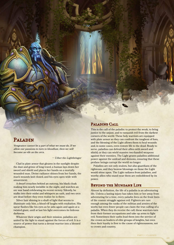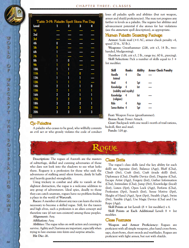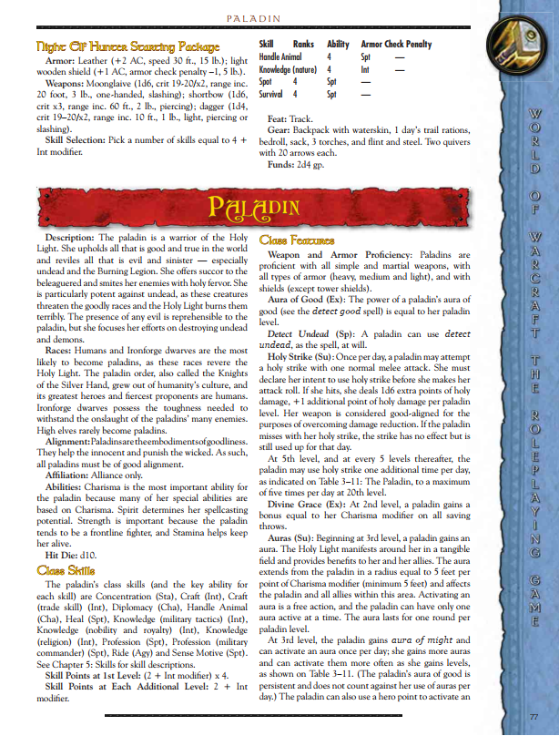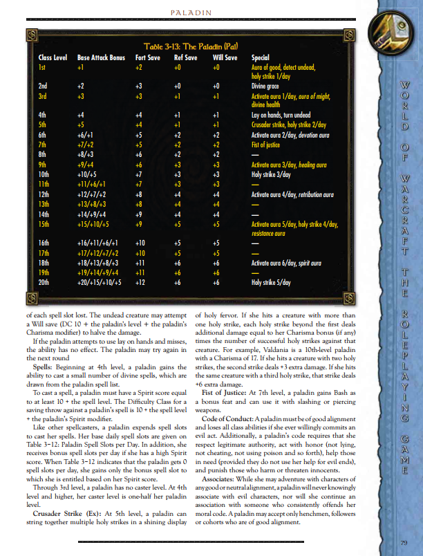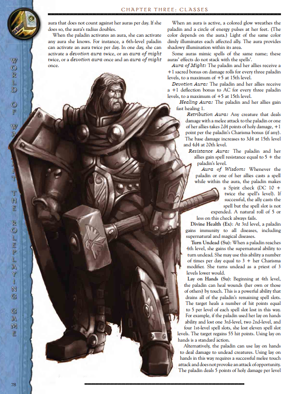 All in all, the Paladin in this game bears a lot of similarity to the standard D&D Paladin. WoW flavour comes from the auras and a couple of named abilities. The class is a little blans after level 7, but you could have some fun here.