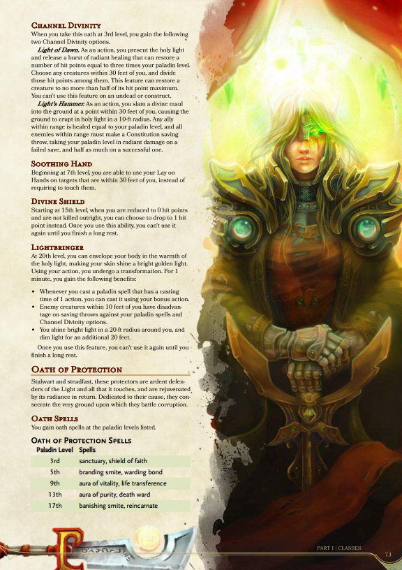 The WoWish flavour of this class definitely comes from the Sacred Oaths. The core class is fine. It’s good, even. It’s just not that different from a standard D&D Paladin. There’s no unique flavour until you delve into the Oaths. At that point, you have an interesting, unique class to play with. Are these oaths very specialised? Yes, especially the Holy Paladin, but that’s ok. It’s fine. It actually really fits with the feel and theme of the game. You’re playing World of Warcraft, there should be clearly defined party roles. That’s how the game works. Does it slightly weaken the individual character? Yes, it does. I don’t think this is a problem, though. I actually really like it and I would probably go a Holy Oath Paladin, given the choice.