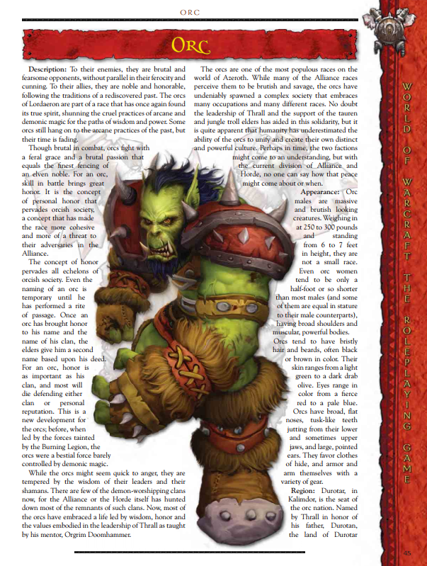 Let’s compare them to the old, official RPG. My intended starting point was to be the races, so we’ll start there. Let’s look at one of the defining races of the setting, the Orc. The Orcs of Azeroth began their story as invading aliens, coming through the Dark Portal to Azeroth from their homeworld of Argus (later Outland). The original RPG presents them thusly: