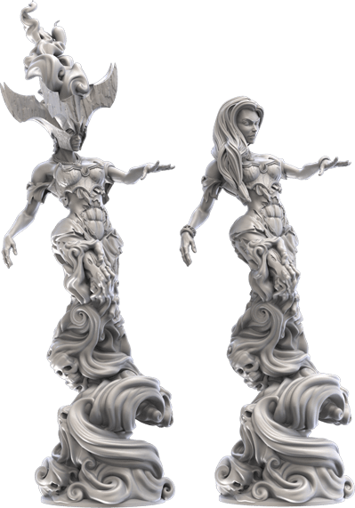 Another feminine option, the Banshee is a beautiful miniature that captures the chiselled, statuesque feel of the existing C’Tan models. She’s pretty tall (96mm without base), but she’d also quite narrow, meaning that she’d work as a Deceiver on a 40mm base or a Transcendent C’Tan on a 60mm one. She’s not cheap, costing €38.90, but she’s also very nice, very detailed and very large. The cost is pretty justified, really. This is a very strong option. I think, to capture to majesty of the C’Tan, I’d probably for for the first, more elaborate head option, with the wings and flame. I think it looks more the part than the hear would on the other head.