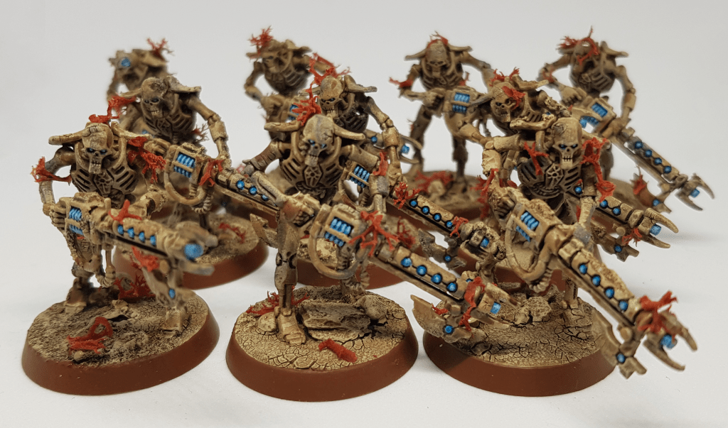 Now, I’ve put some pictures of the miniatures below. Because the bulk of this batch comes from a second Indomitus set, you’ll see a lot of overlap from the previous post. The Necron Warriors, Canoptek Scarabs, Skorpekh Destroyers, Cryptothralls, and the Canoptek Reanimator are all duplicates. These are the same sculpts as previously painted, but these are fresh photos of fresh paintjobs.