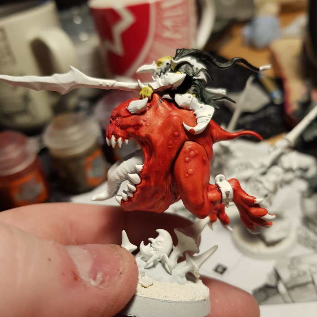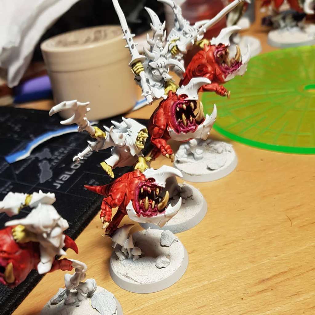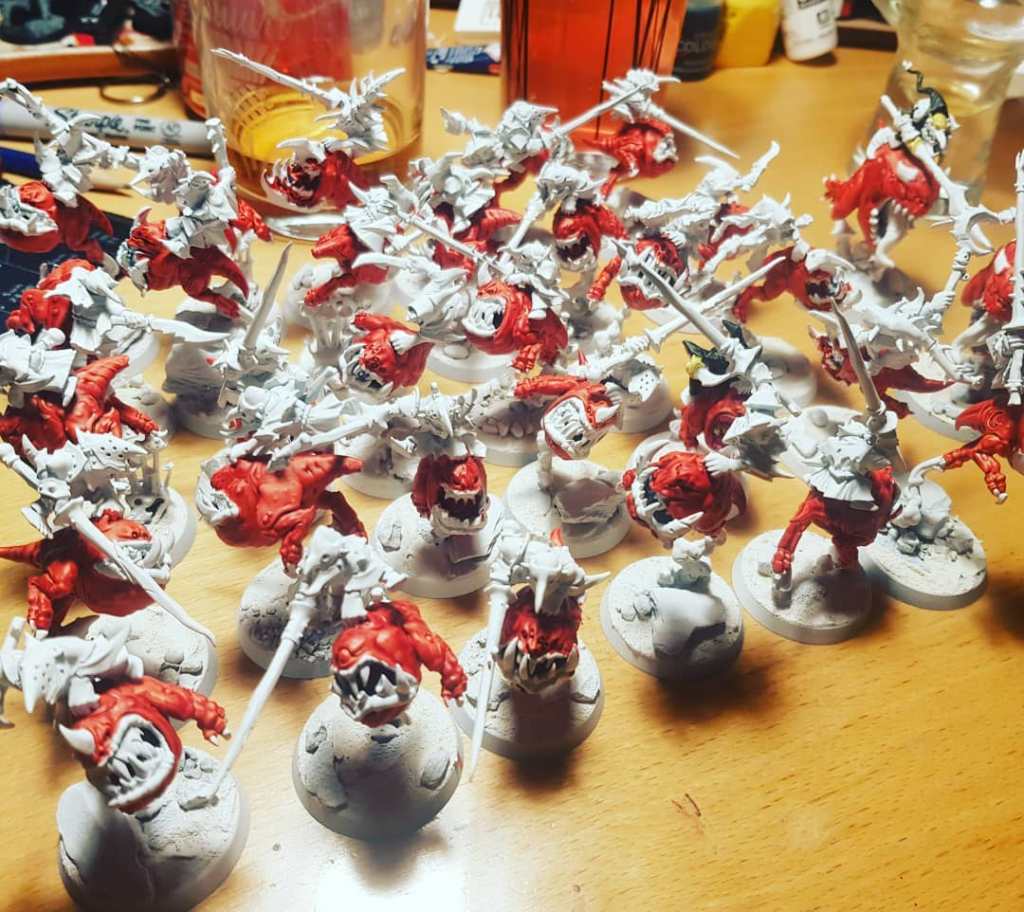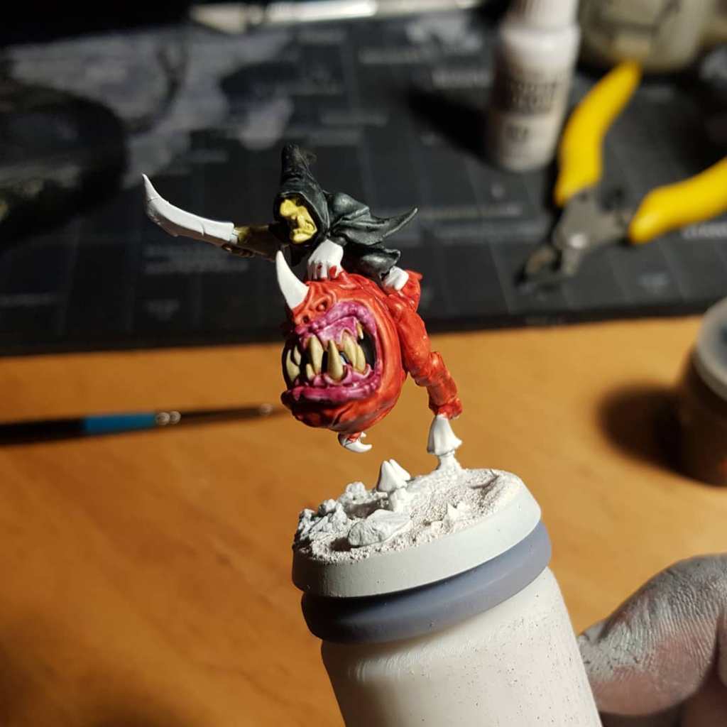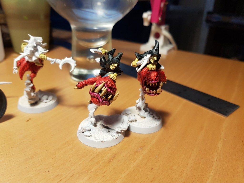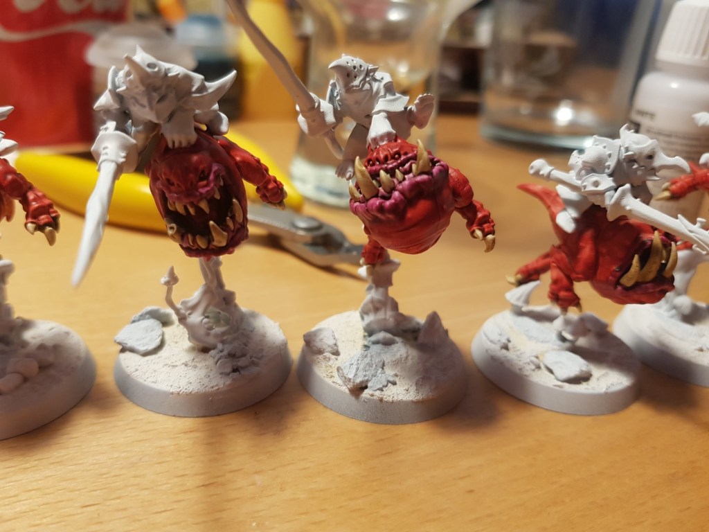 Having built the miniatures, I’m now working my way through painting them. I’m not making super fast progress, but I’m getting there. My intention is really to use Contrast Paints as much as possible, and I’m happy with my progress so far. Here are some pictures of my first in-progress miniatures, which are the Squig Hoppers and Boingrot Bounders:
