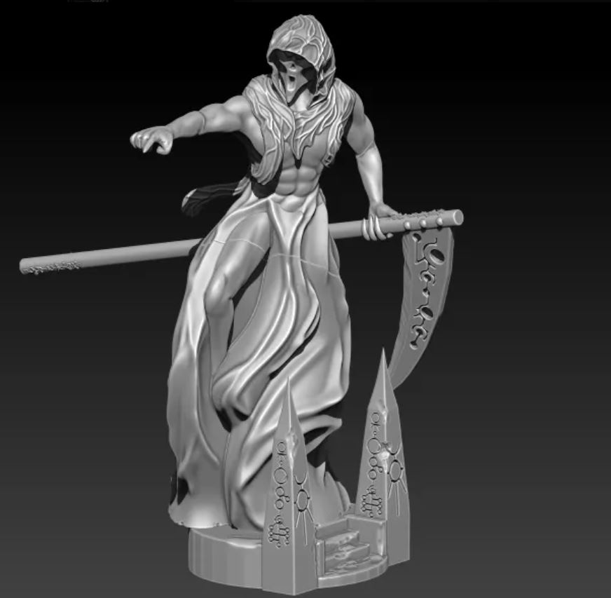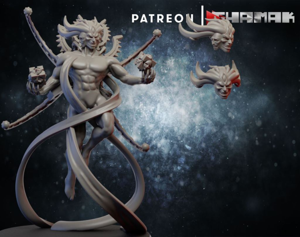 A straightforward Deceiver proxy released by Ghamak for you to print at home. Ghamak makes a lot of really cool miniatures and I do quite like this one. The body seems a little doughy, and might lack definition, but I often think that with these minis and am quickly reassured when I see them properly printed off. I like the the designer has started with the core elements of the original miniature – the twisted fabric and the humanoid form – before bringing in some elements that we have seen elsewhere in the Necron range. The backpiece is reminiscent of that of the Void Dragon, and I love the puzzle cubes, like the ones held by the Chronomancer. The alternative heads are pretty interesting too. You have a traditional single-faced head that is similar to the of the original miniature, but there’s also a cool, multi-faced alternative that I think captures the theme of The Deceiver beautifully. Again, I love those cubes…