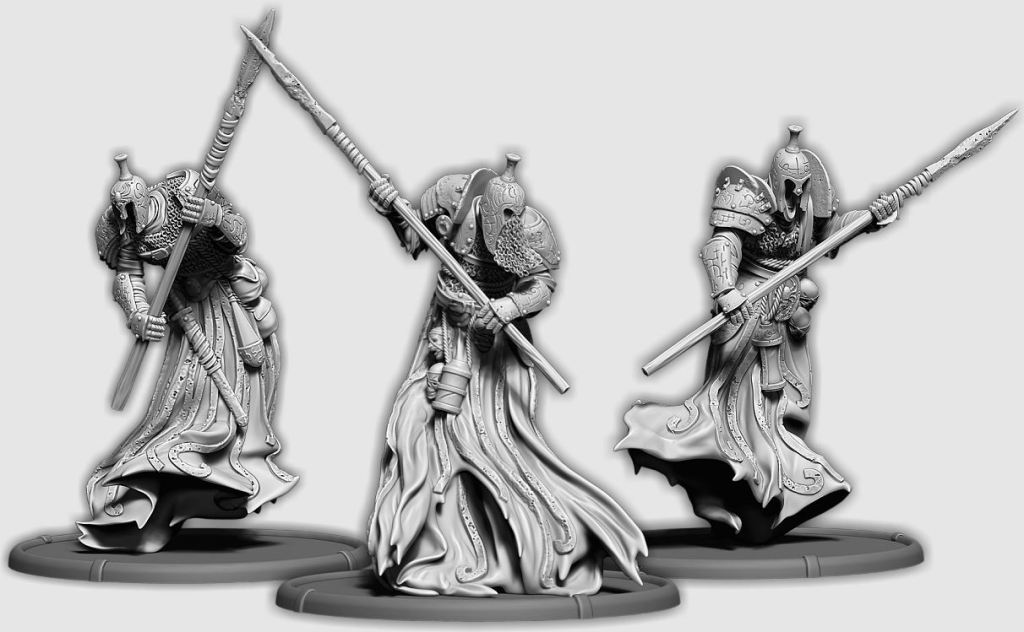 There are bound to be more miniatures from Mierce that fit the bill, but let me share these ones for now. These should be roughly the same size as Morghasts. Ish. Maybe. The more undead looking ones give that Nightbringer look and give some lovely, billowing robes to play with. As usual, I’d suggest maybe swapping out a weapon to make it seem more Necron. The other, more amroured miniatures are quite different to the other available C’Tan but are ultimately humanoid in shape. You have some cool robes that obscure legs and connect with the base. You have some nice spears that can be cut up, their blades being replaced by some from, say, a Lychguard set. Cool minis. Would make nice Transcendent Shards with minimal effort.