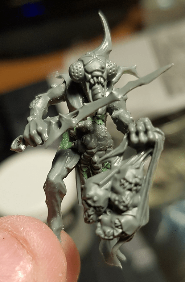 So that’s two minis using the Revenant parts, but most of the bodies I have are Dryads. My third test mini used a Dryad body. I took a mound of maggots from the Plaguebearer kit that I think were intended as basing materials. I shaved down the underside, trimmed ones end and attached it to the body to be a maggoty stomach. With a bit of greenstuff to blend it in, it looked pretty good. Plaguebearer arms followed, with the sword arm being trimmed at the shoulder to allow for repositioning. The head is the awesome fly head from the Plaguebearer kit. Since the photo was taken, I added a branch to the model’s back to add some height and bulk.