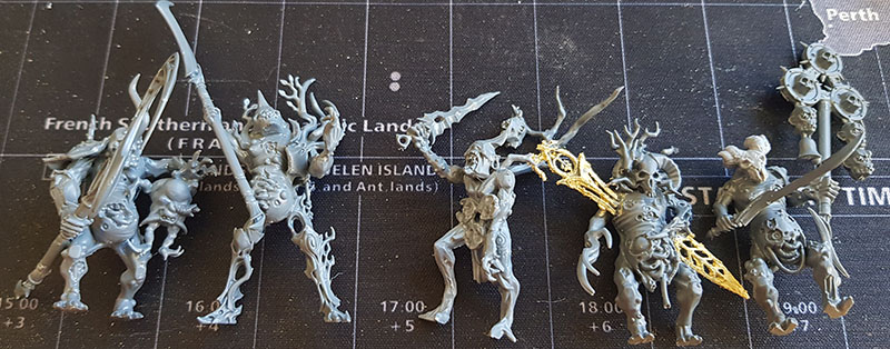 The first of these units was my first 10 Plaguebearers. Made of a combination of different parts from the Plaguebearer, Plague Drone, Dryad, Revenant and Kurnoth Hunter kits, this is my first battleline unit. I love that each mini is quite unique. The three initial test models are in here and are the only ones that are properly “finished”. The rest will need significant amounts of greenstuff to fill some gaps and make some joins look a bit more natural.