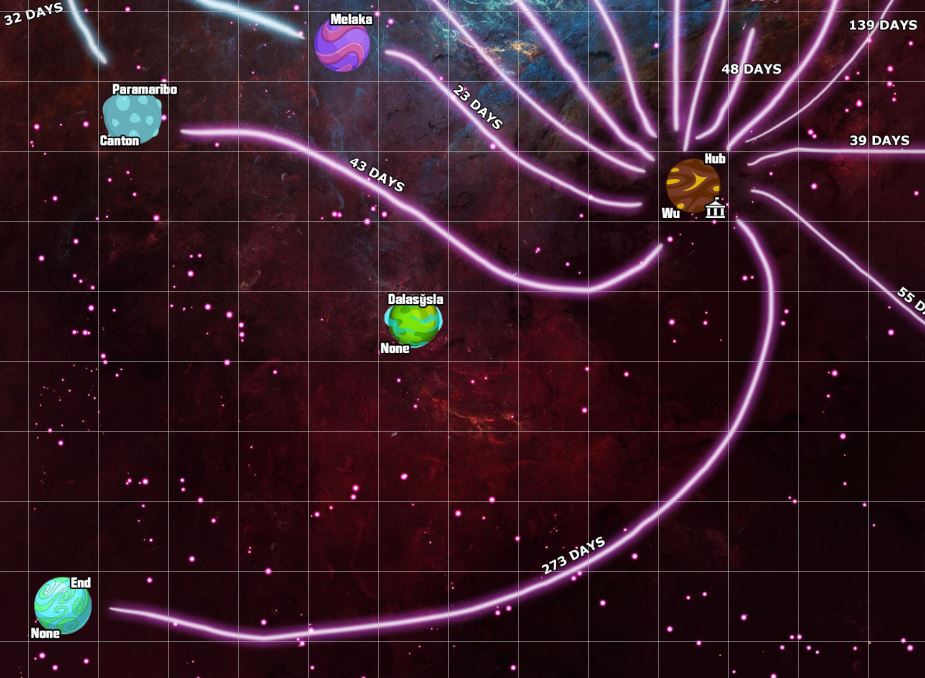 The initial session began with the party on a shipping vessel, the Tell Me Another One, as it undertook the 9 month journey to End, the furthest-flung planet of the Interdependency in order to deliver some weapons to the reigning Duke to help him put down an uprising. Here’s a portion of the map that I made, showing the flow shoals from Hub, the capital of the Interdependency, to End: