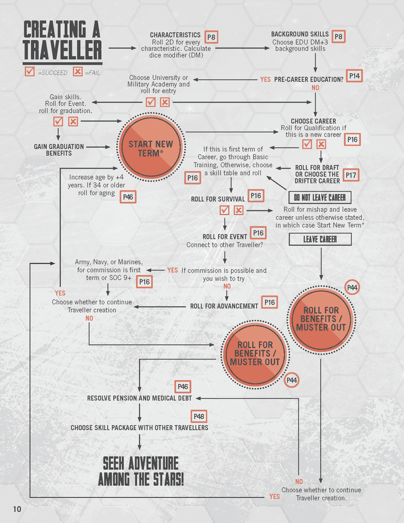 Now, I’ve finally gotten around to it. Got a few guys from our local group and we spent last Wednesday writing up some characters and doing an initial scenario. The thing about Traveller is that character creation is quite… involved. Rolling up some stats and choosing some initial skills are important parts, but that’s just the start of the process. You go on to actually play out, via tables and dice, the life that your character leads in a series of four-year blocks. Here’s a handy-dandy flowchart to explain the process in a clear and concise manner: