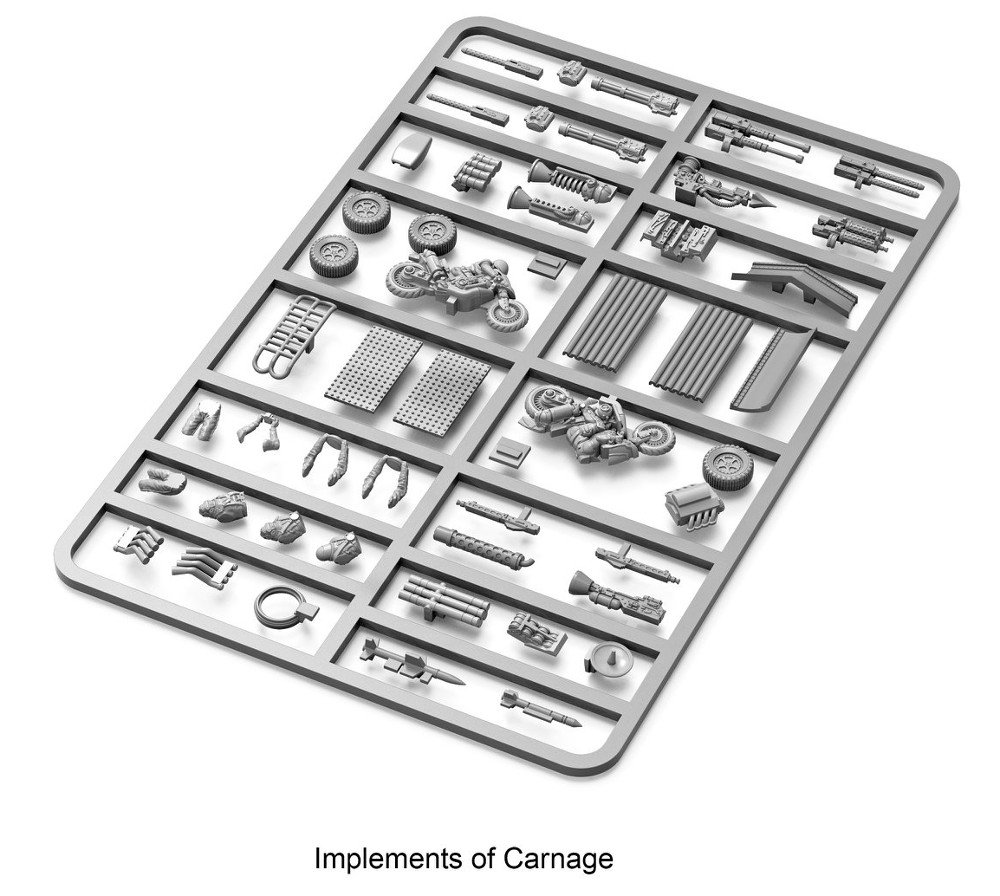There’s been some interest in Gaslands locally, with a few games being played a couple of years ago. As with Frostgrave, I’m keen to put together a couple of forces and seeing where it all takes me. I picked up some old diecast cars from eBay a couple of years ago, but haven’t realyl done anything with them. I also 3D-printed some weapons to attach to the cars, but they didn’t look great. They really should have been printed in resin, rather than the PLA I used. More recently I ordered the Implements of Carnage sprue so give me a nice little stock of bits for this project that I will never actually get around to: