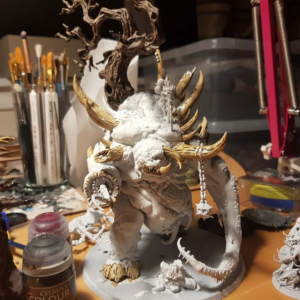 It was easier than expected to get the tree into place, and a little green stuff saw it firmly fixed in place. The Glottkin might be horrendously overcosted and may lack coherency with the rest of my list, but it’s also one of the best models in the range, so I’m going for it! I#m not far into him yet, having just started putting down the larger areas of bone, tooth or horn.