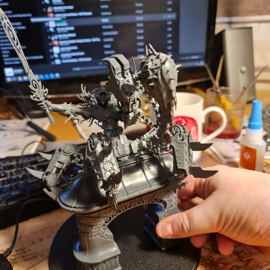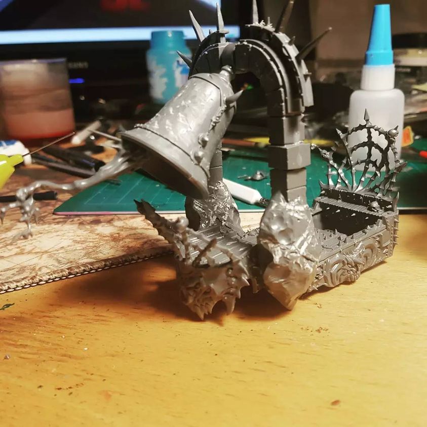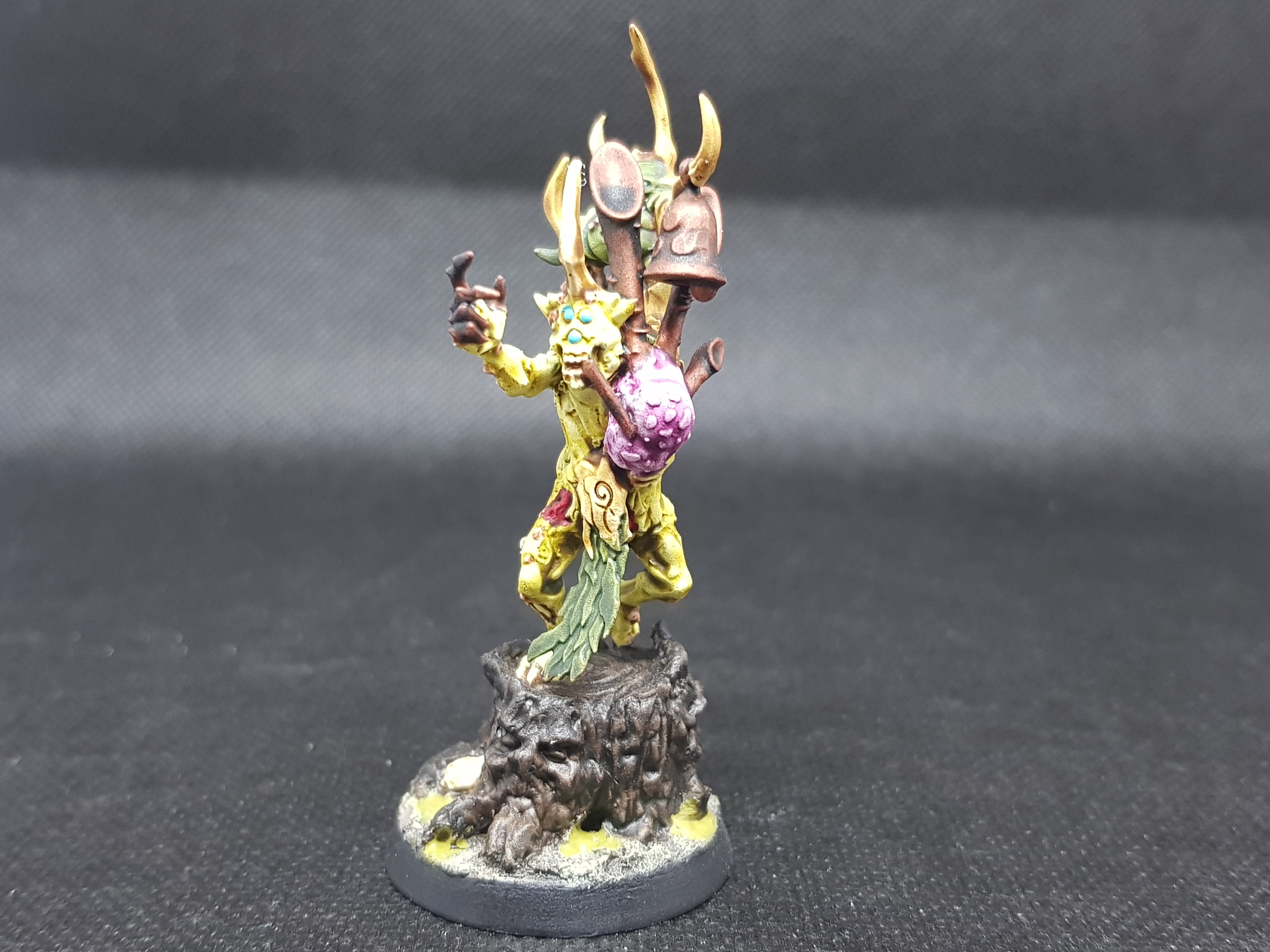 • Soul Grinder: Treeman body used to replace Daemonic body. Giant Plague Censer from Plague Furnace added to claw arm. Other arm replaced with treeman arm and blade. Scenic base created with arch from Lumineth terrain piece.