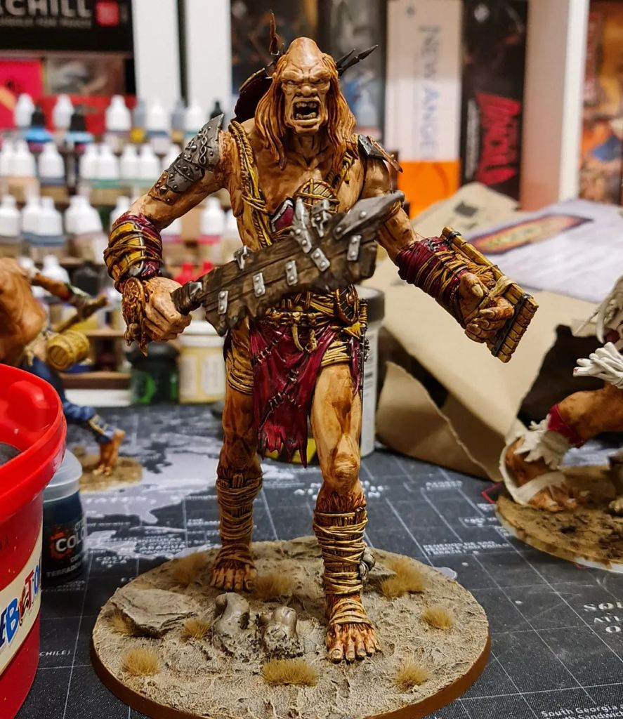 I have a mix of GW and Mantic giants and decided to try painting one of the Mantic ones first. For the price (Affiliate Links: The Outpost | Element Games) these guys are massive and look great. They’re actually taller than the Games Workshop Mega-Gargants, though this may be due in part to their better posture. The PVC that Mantic use to make them is a bit of a pain to work with, though… There’s a bit of a shine to him, but the matte varnish will help with that once the cold subsides enough for me to spray.