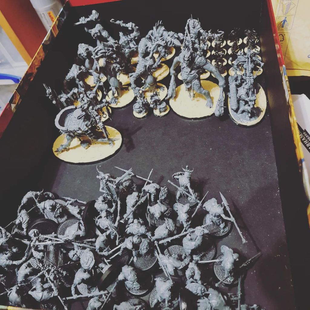 Actually, speaking of basing, don’t I have a 2k Kruleboyz army that I built in December and which I also need to base? Well, damn. Did that too. Here’s a pic of me about halfway through, with just 40 Gutrippaz and a Snatchaboss to go:
