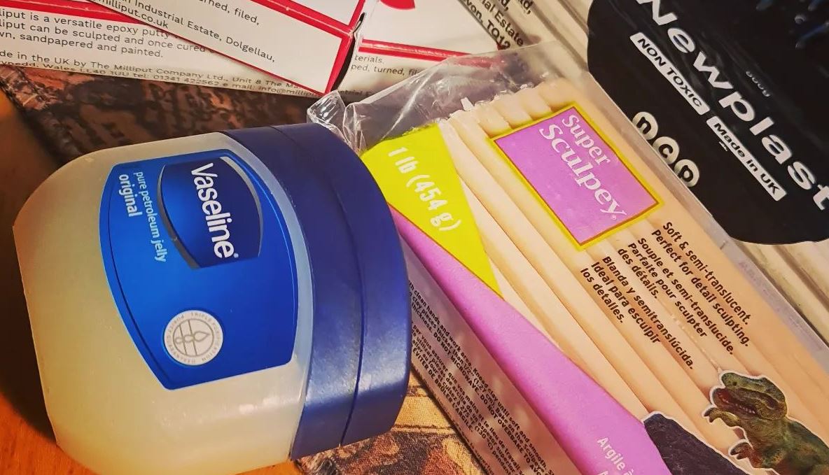 More Milliput, some Sculpey, plasticine and Vaseline. The Sculpey is one that I am really keen to try. The plasticine will go into a 50-50 mix with the milliput to give that little bit more elasticity when working with ut. The Vaseline will protect the rollers from sticking to the clays and putties so that I can stop adding so much water.
