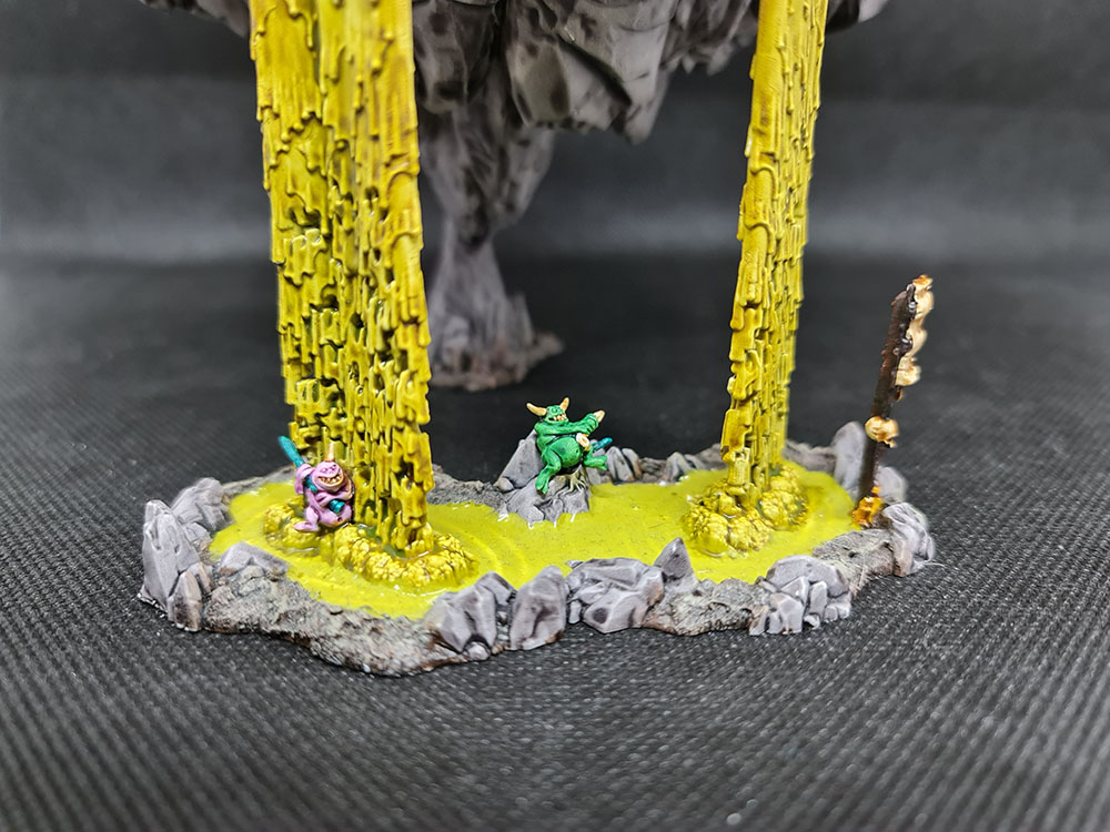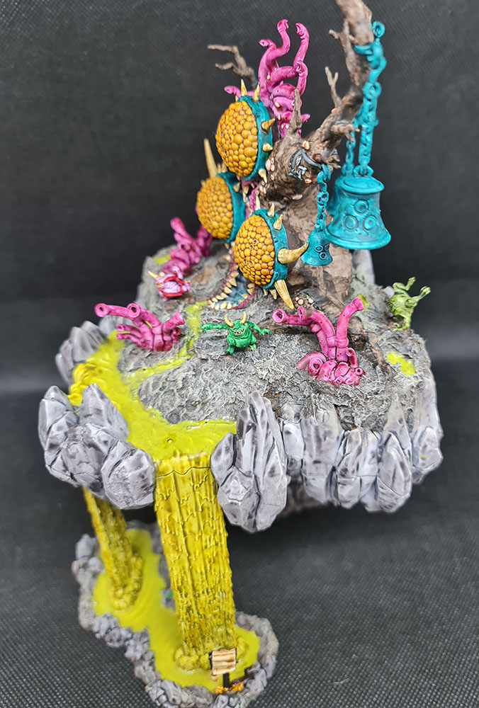 They’re just having a good time! I cut one of the Nurglings in half to have him emerging from the waterfall. Smilefall? Feculencefall? Either way, his butt got cut off.