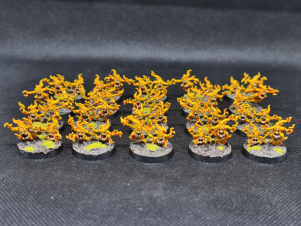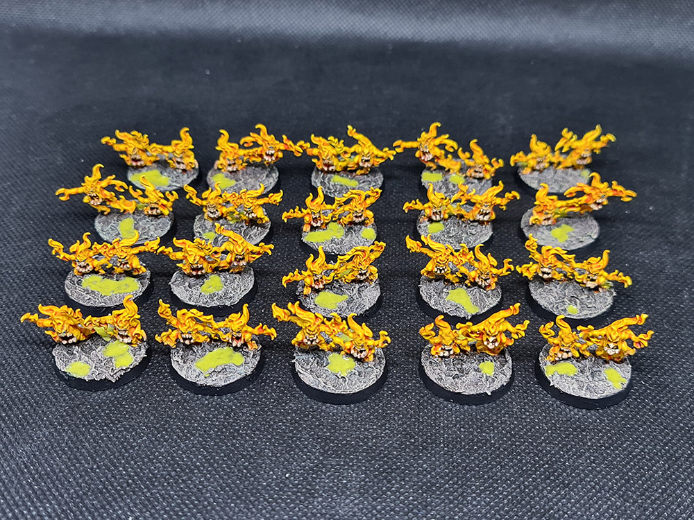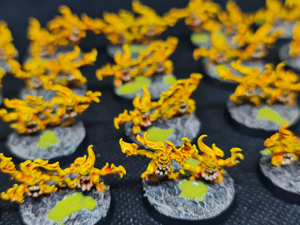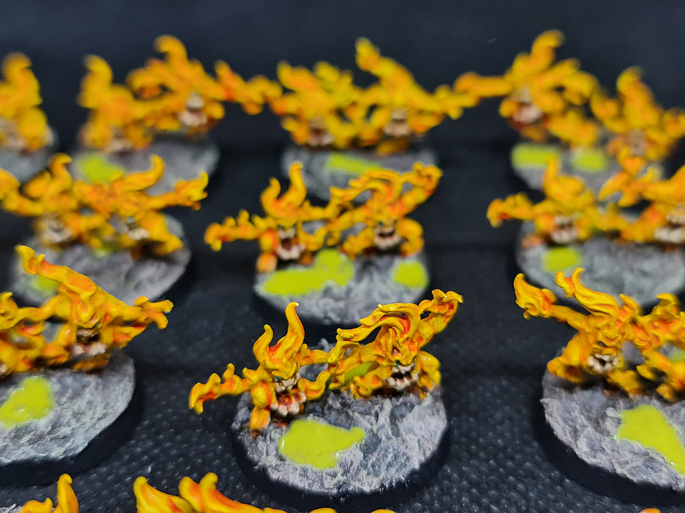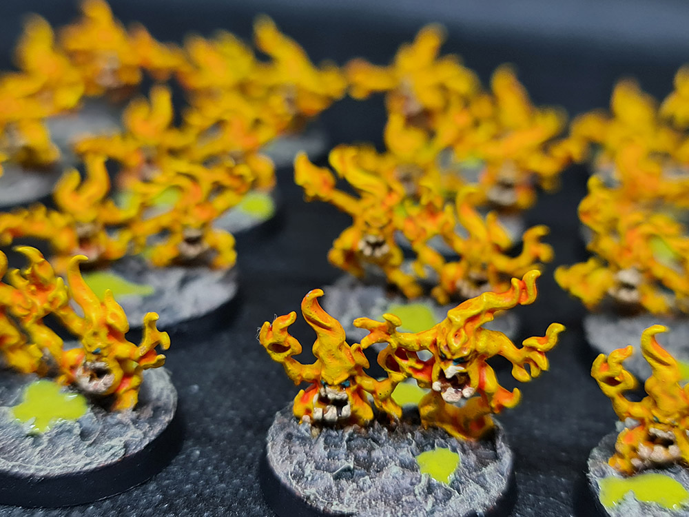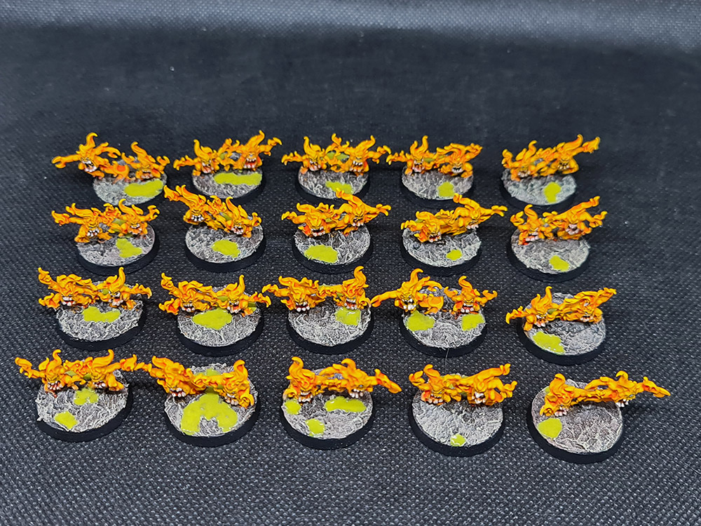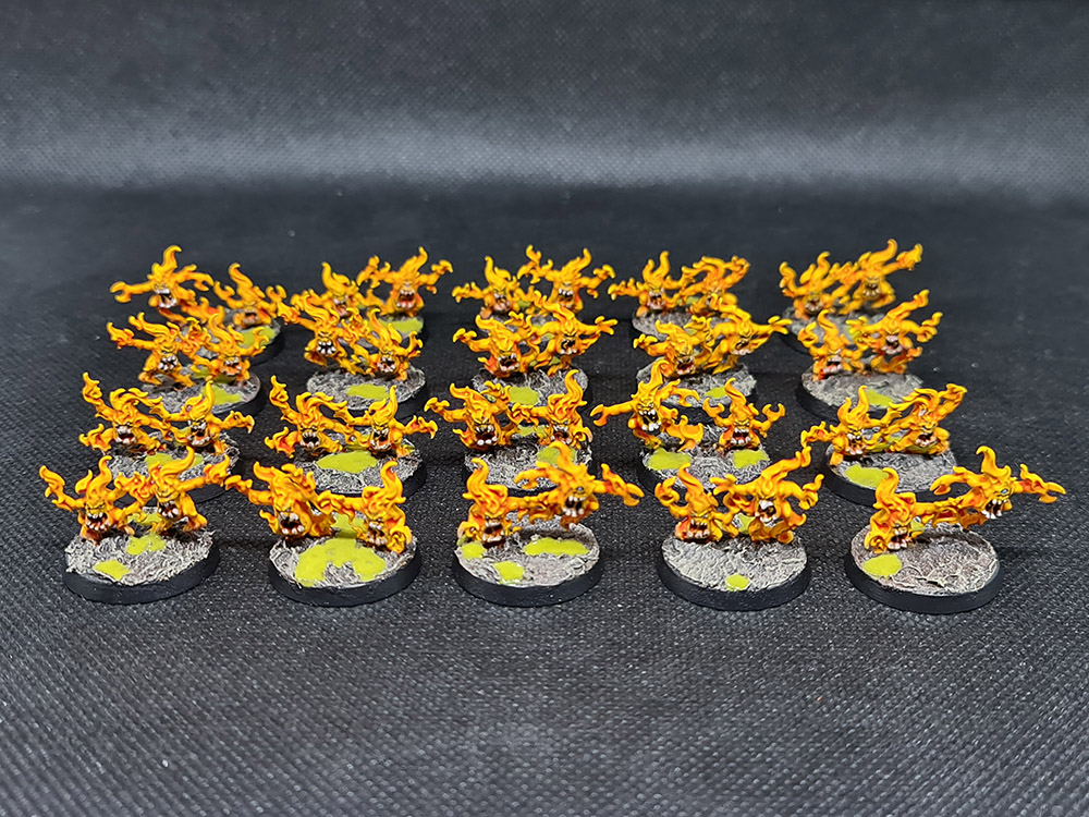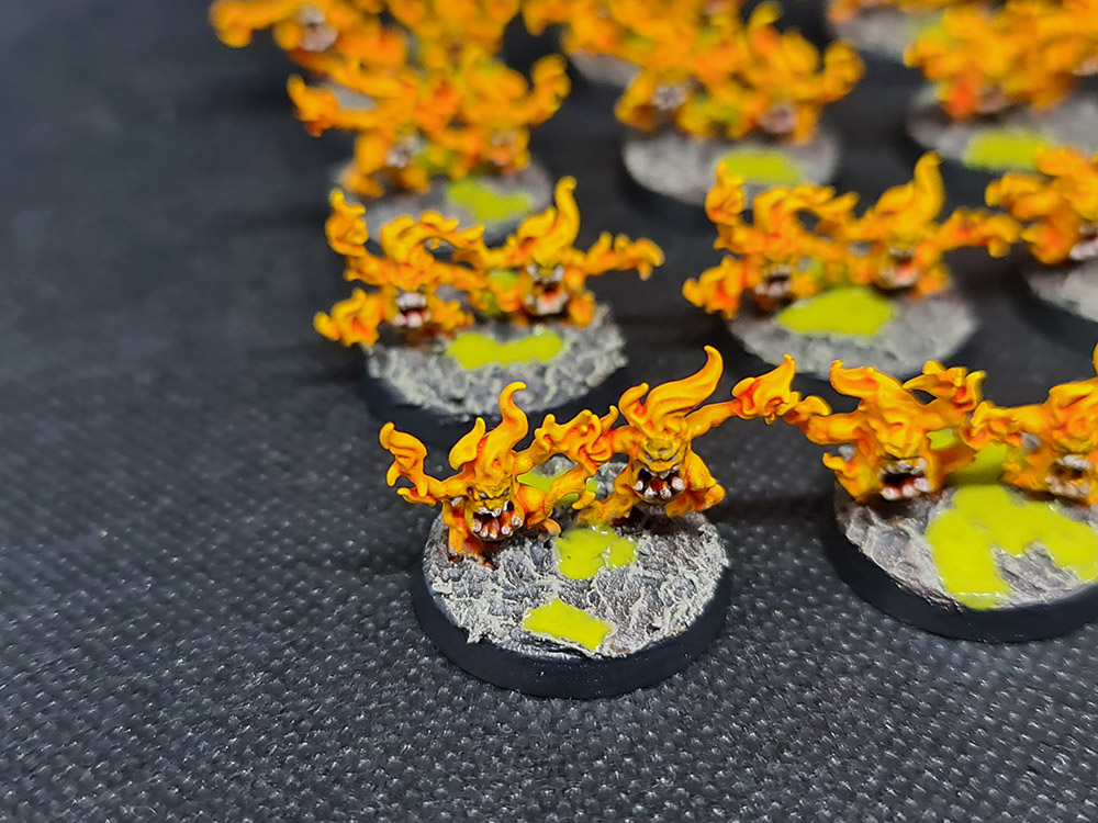 Next up, I finished up the Brimstone Horrors. There a 40 of these wee blighters, and they needed teeth and eyes picked out and then basing. This was pretty minimal, with all of the lovely yellow already done:
