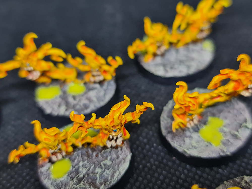 The brimstone took very little time. Spray painted yellow. Orange ink wash over the yellow, which settles in the recesses. Then pick out the teeth and eyes. Fastest minis ever.