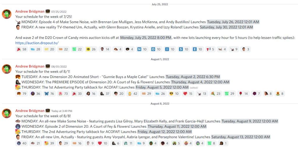 That’s another issue. The waiting. There’s not a gushing pipeline of new content here. This is an example of the schedule, as posted in the Discord:
