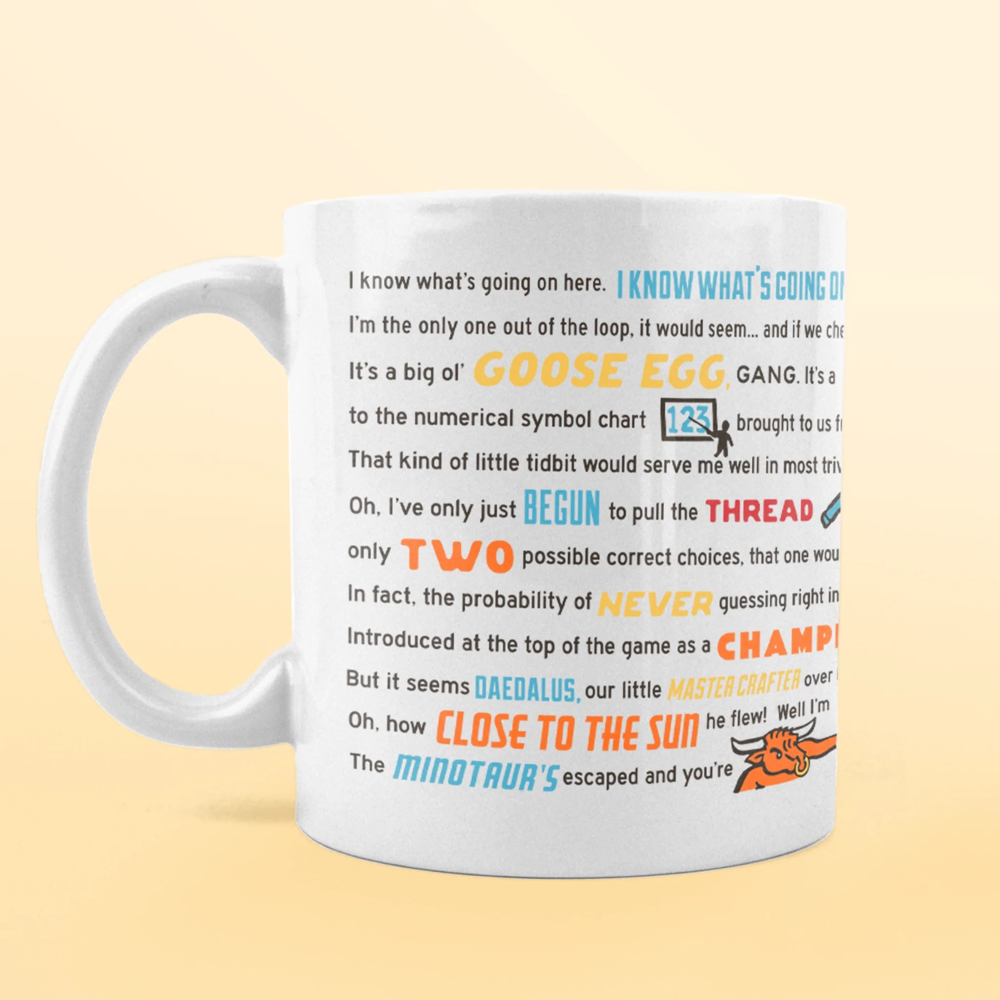 Example of the specificity include the mug, above, which displays a transcript of a rant/monogue from Brennan Lee Mulligan on the show, Gamechanger. This is a definite spoiler for the episode, so maybe don’t click the video if you intend to watch it:
