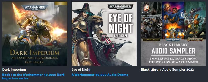 Most of the Black Library novels I listen to are Horus Heresy ones, so I’ve not read a huge number of these. There are a few that I enjoyed, though. Indomitus and Dark Imperium are both solid, especially Dark Imperium. Our Martyred lady is also really good, and has a surprisingly good cast, including Catherine Tate, for some reason. She plays Inquisitor Greyfax and does well in the role.