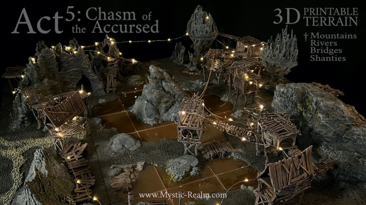 Mystic Realm is continuing its series of narrative-heavy 3D printable terrain projects with Act 5: Chasm of the Accursed. It fits the bill. Let’s start with a project video and some photographs:
