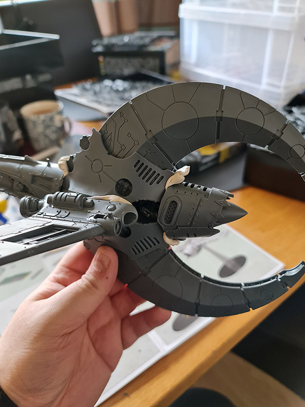 The ship that’s the furthest from being finished is the big one, meant to represent Krondys, one the huge, named Dragons from the Stormcast Eternals battletome. The core of the ship – which is all I have so far – is made up of an Ork Dakkajet and a Necron Death Scythe: