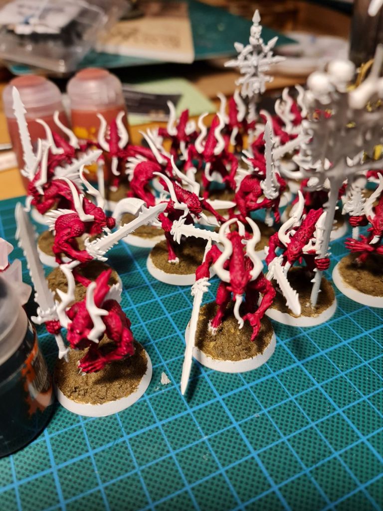 Keen to not lose the motivation, I settled down to just paint whatever came to hand, drawing on a couple of different options. The first of these was a set of 20 Bloodletters who had found their way into my 40K Chaos Daemons list.