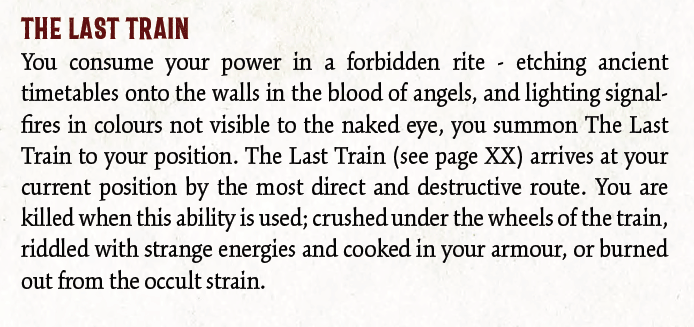 My favourite thing about the game is the zenith abilities. These follow zenith beats, which are big, climactic events for characters that progress their story arc and unlock the zenith abilities. The use of the zenith ability will normally kill a character in a satisfyingly dramatic manner. For example, the zenith ability for the Vermissian Knight reads: