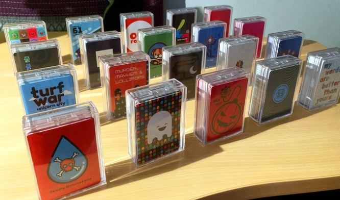 Joshua Mason has run over 40 Kickstarter campaigns by this point. I first became aware of his work about two years ago but I can’t say I’ve really checked in since. Looking at pictures like the one below, it seems that Mason has produced a lot of small card games. I quite like that they have all share a similar form factor, which gives them a nice uniformity, despite the very different visual designs: