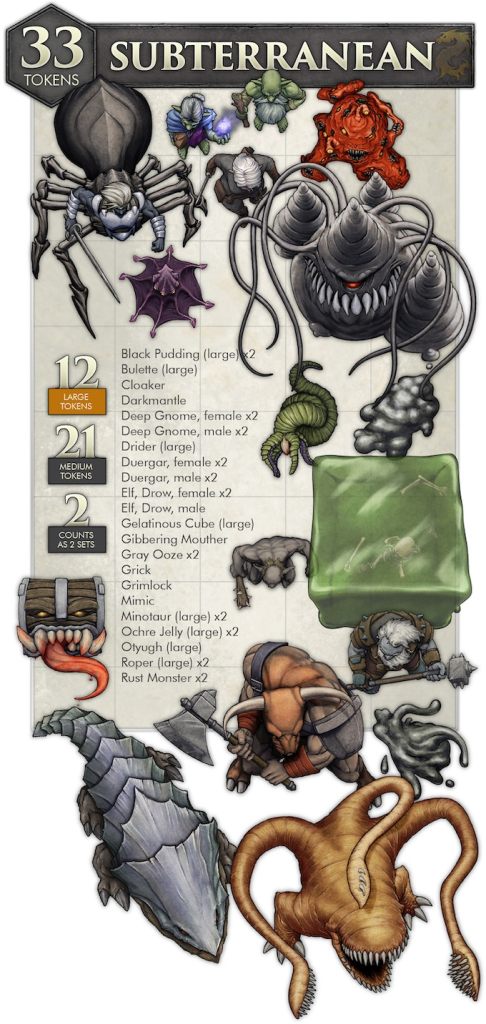 There is, of course, a range of different sizes of tokens to go along with the many different creatures represented in the set. There are a number of differently-themed sets that you can pick up. My favourite of these is the subterranean set:
