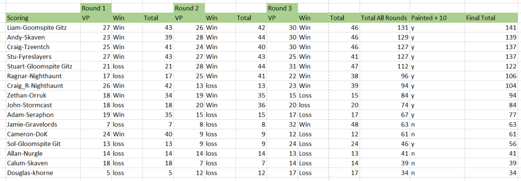 Well, things went better this time, and I’d tabled the whole army, except for Morathi herself, by the end of turn 2. Really, I’d killed most of it in turn 1, picking off all of the Galletian Champions very early. I scored a mighty 28, which was the joint-highest for the round. My opponent scored 9 points. This was a pity, as I really feel that I got some incredibly lucky rolls, including some good spellcasting. My opponent also made some errors in deployments, and I feel that I blocked Morathi well with my Mangler Squigs, redeploying into a better position to take her charge and protect my smaller squigs.
