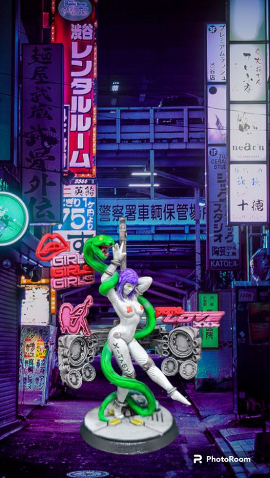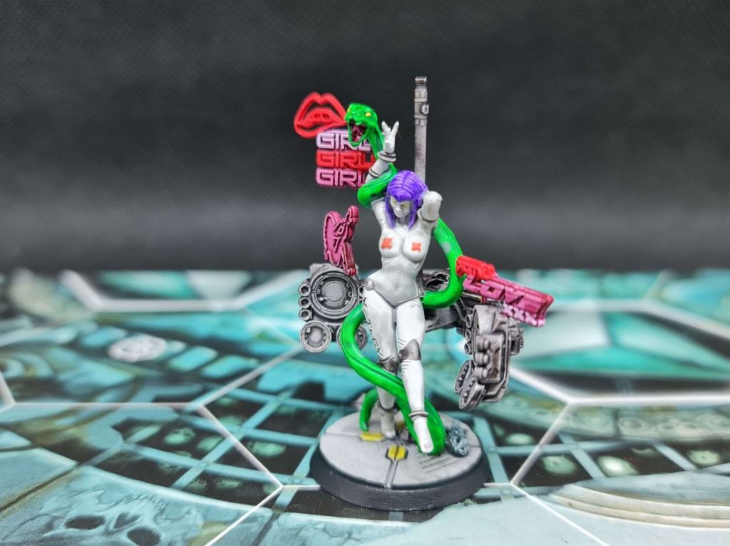 I’ve been toying with some Cyberpunk models on the 3D printer. The first of those that I’ve managed to actually get painted is this one from Heroes Infinite, the 3D printing brand of Raging Heroes. Meet X-TASY: