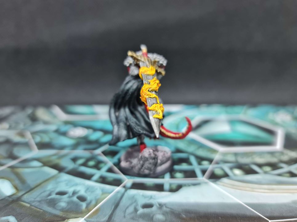 Yeah, the head was a bit tricky to paint, being very small and finely detailed. I managed to get a wee speck of blue into the eyes, but the camera isn’t really picking it up. The sword is simple, but it looks cool wreathed in flames.