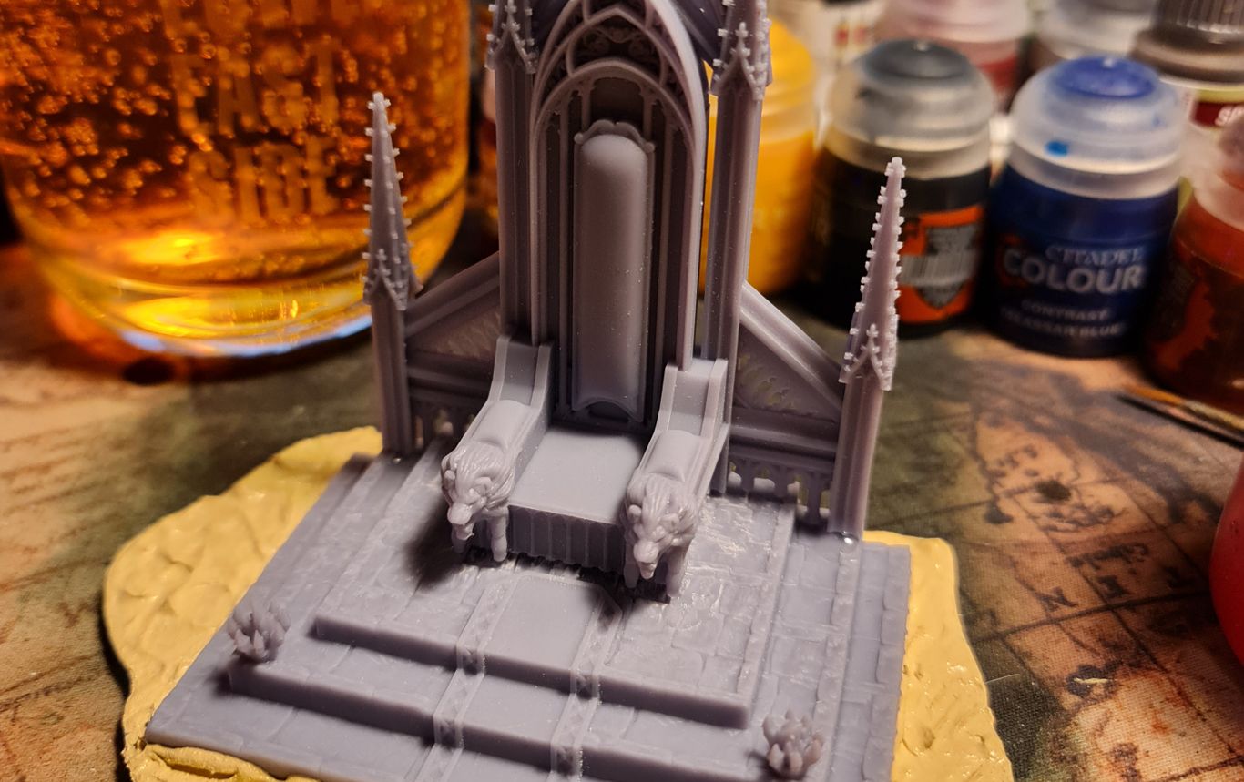 I printed this in three pieces. The Throne itself was the main piece. The stepped base was the second. Both of these came from Raging Heroes’ 3D printable miniature line, Heroes Infinite. They have an Arthurian Legends set that is absolutely gorgeous. If I expand the army later, I’ll likely mine this set for models. The final part was a flat base on the bottom. Someone created a cutout of the shape of the base of the Charnal Throne. It originally printed off at 1mm thick. This printed well but warped during curing. Reprinting at 3mm thickness sorted this issue.