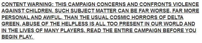 I think there’s definitely a place for this kind of darker content. I think that a game like Delta Green, which deals in supernatural darkness that’s anchored in our contemporary world is a good place to explore it. I’d be keen to read this book, though I don’t know that I’d want to run it.