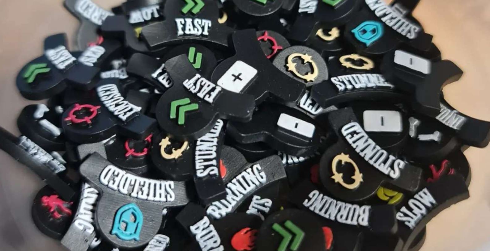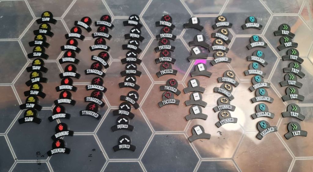 A third batch of Malifaux tokens? Yes, but these are quite different to the larger, 30mm tokens that I previously featured in my other two posts. These are little status tokens that show what effects apply to your minis. Given one of my opponent’s predilections, I expect to have to make extensive use of the burning one…