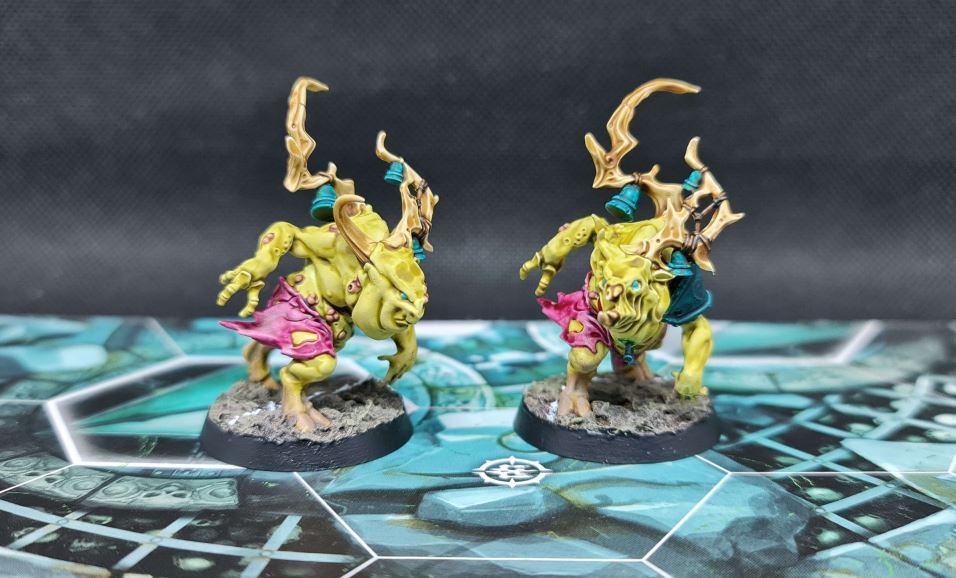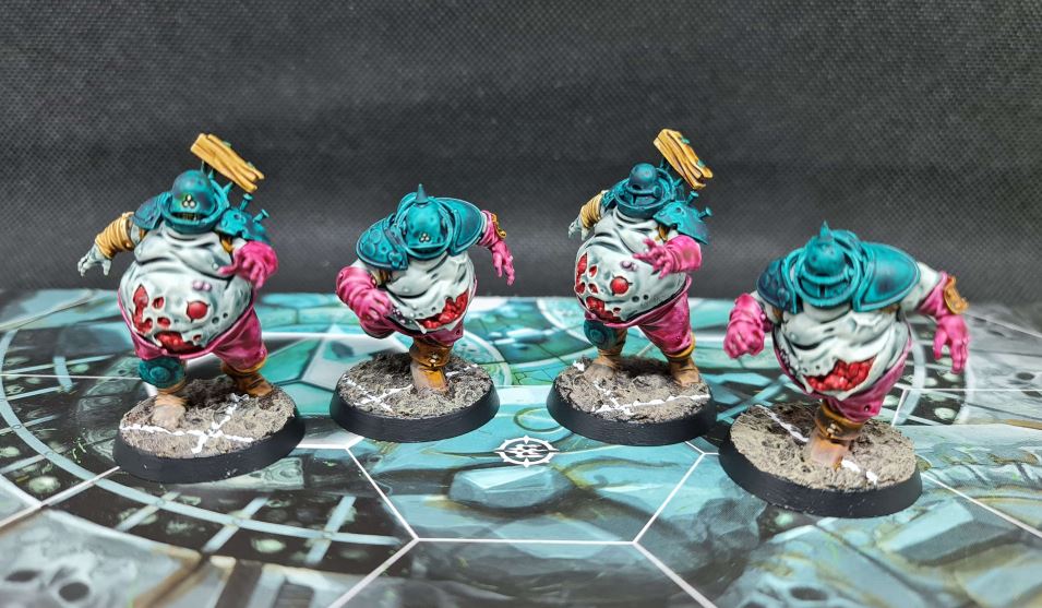 Scheme-wise, I went with the same colours that I use for my Maggotkin of Nurgle army for Age of Sigmar. This means turquoise and pink. Here’s the completed team: