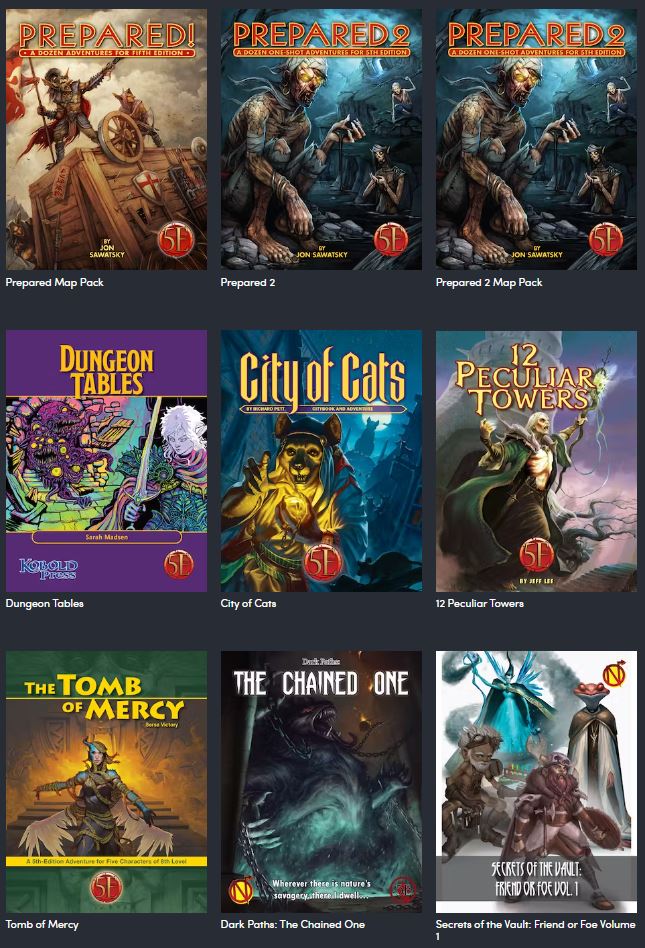 I also really like the Prepared books. These are collections of one-shot adventures which, again, come from Kobold Press. These are great as one-shots, as scenarios to be dropped into your campaigns, and for events and conventions.